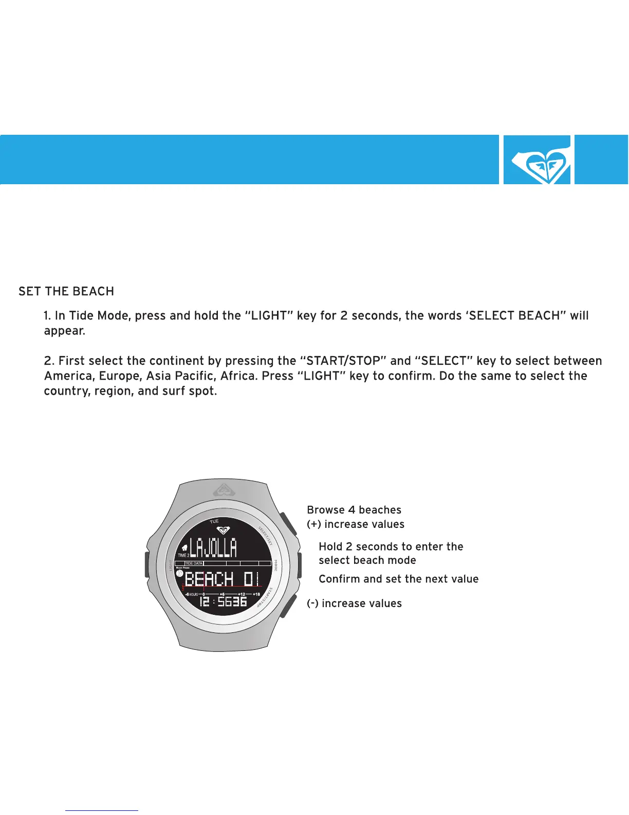 Roxy DEEP - SET THE BEACH; Entering Beach Selection Mode; Navigating Geographic Locations