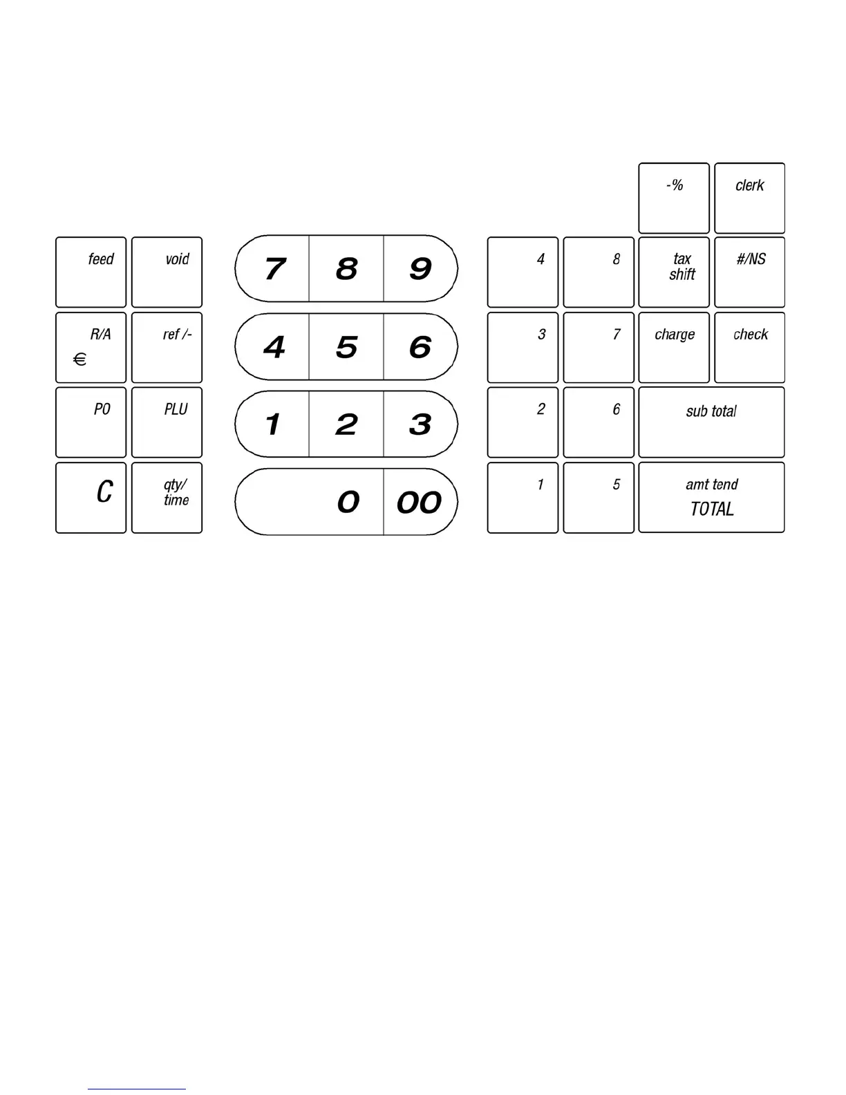 8. [ qty/time ] - Dual-Function: Multiply & Time Display - Multiplies [DEPARTMENT], [PLU] or [Ref/-] key entries; also