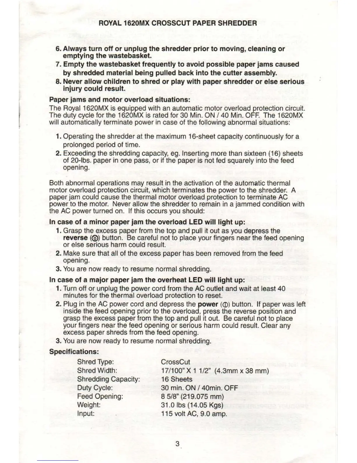 Royal 1620MX - Troubleshooting and Specifications; Resolving Paper Jams and Overloads; Technical Product Specifications