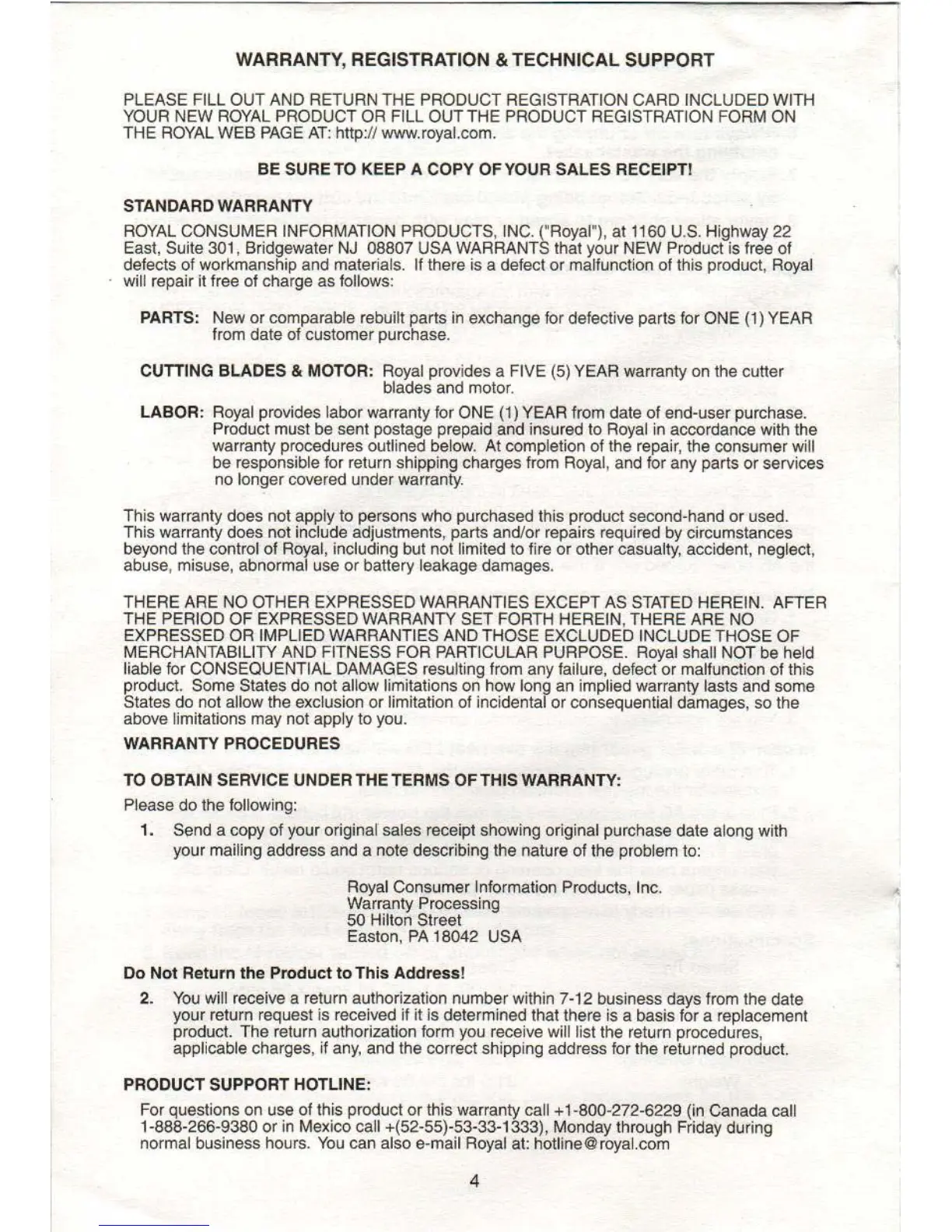Royal 1620MX - Warranty and Customer Support; Standard Warranty Coverage Details; Warranty Service and Return Process; Product Support Contact Information