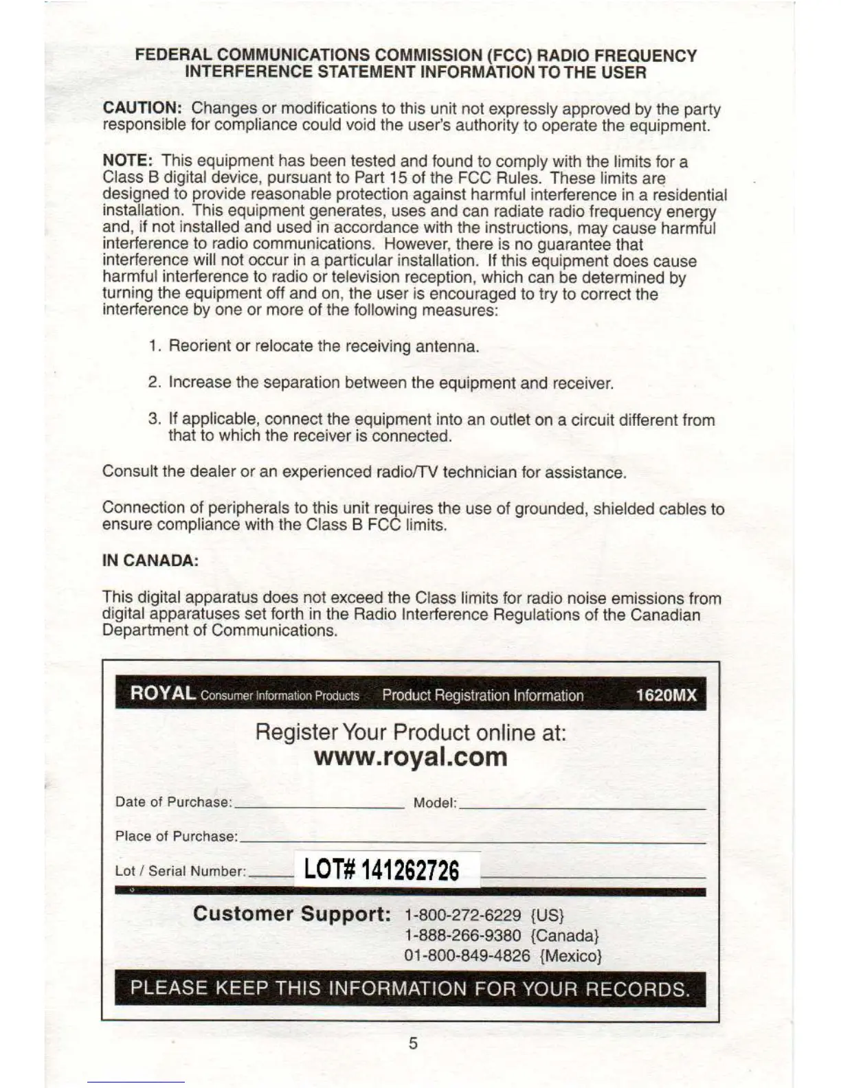 Royal 1620MX - Regulatory and Registration Information; FCC Radio Frequency Statement; Product Registration and Records