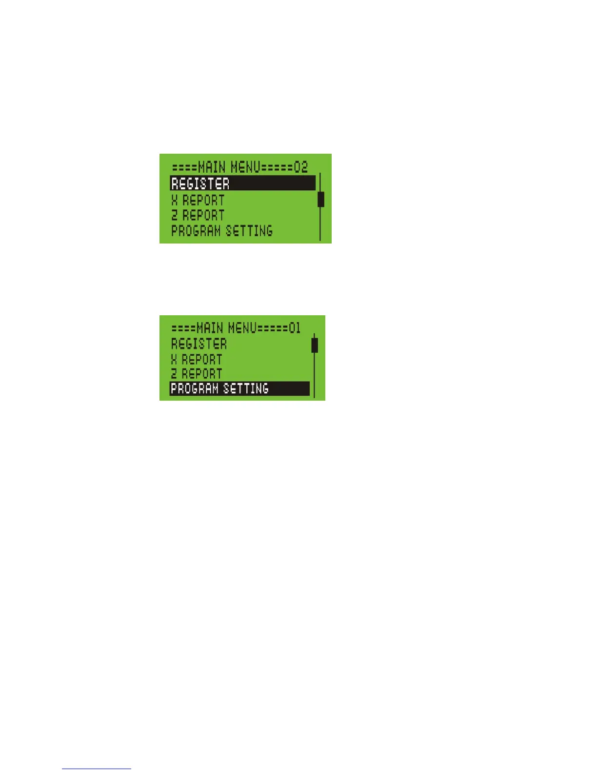 The menu system prompts you through PROGRAM SETTING and sales. Always