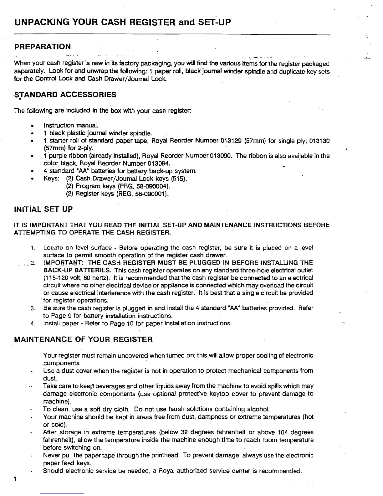 separately. Look for and unwrap the following: 1 paper roll, black journal winder spindle and duplicate key sets