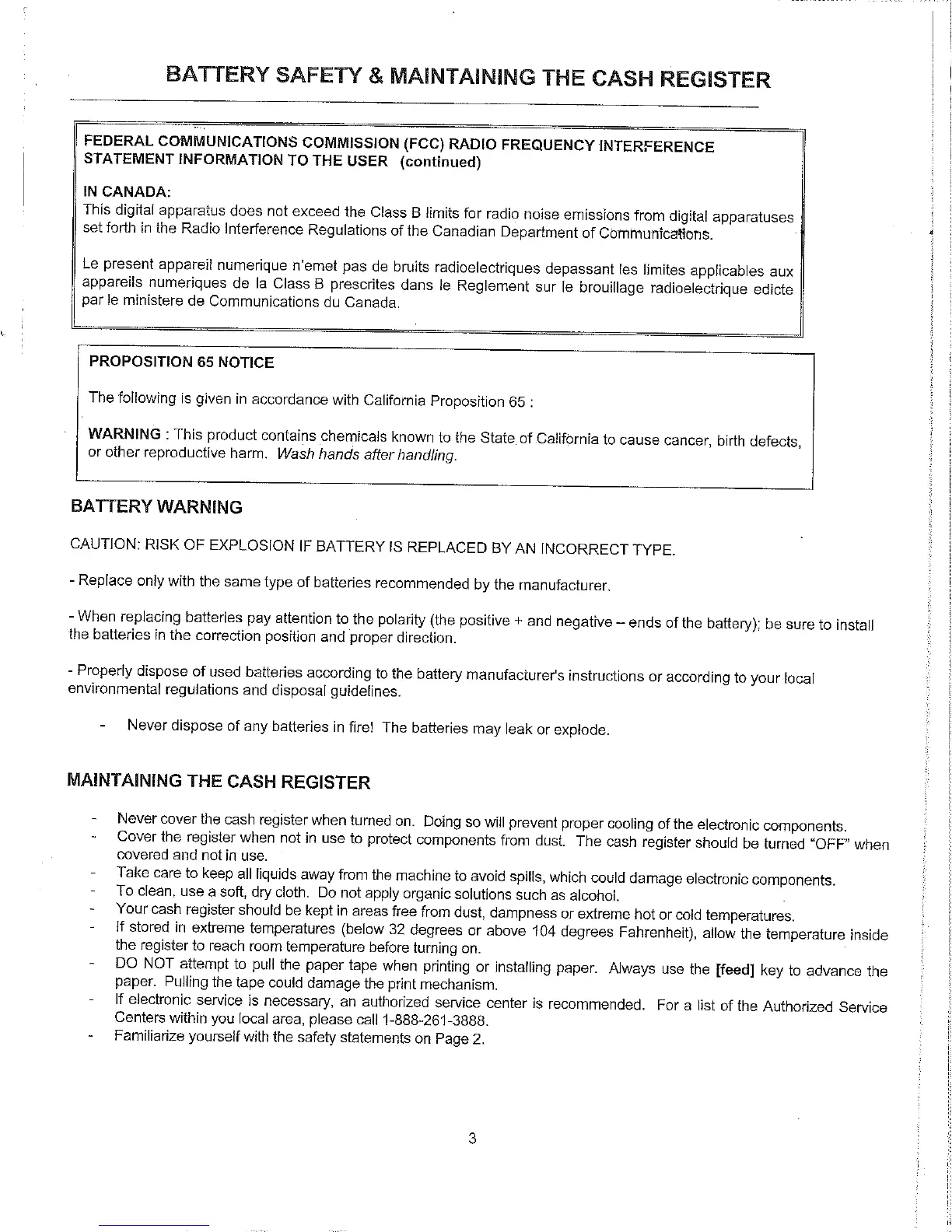 Royal 500dx - Battery Safety and Maintaining the Cash Register; Proposition 65 Notice; Battery Warning; Maintaining the Cash Register