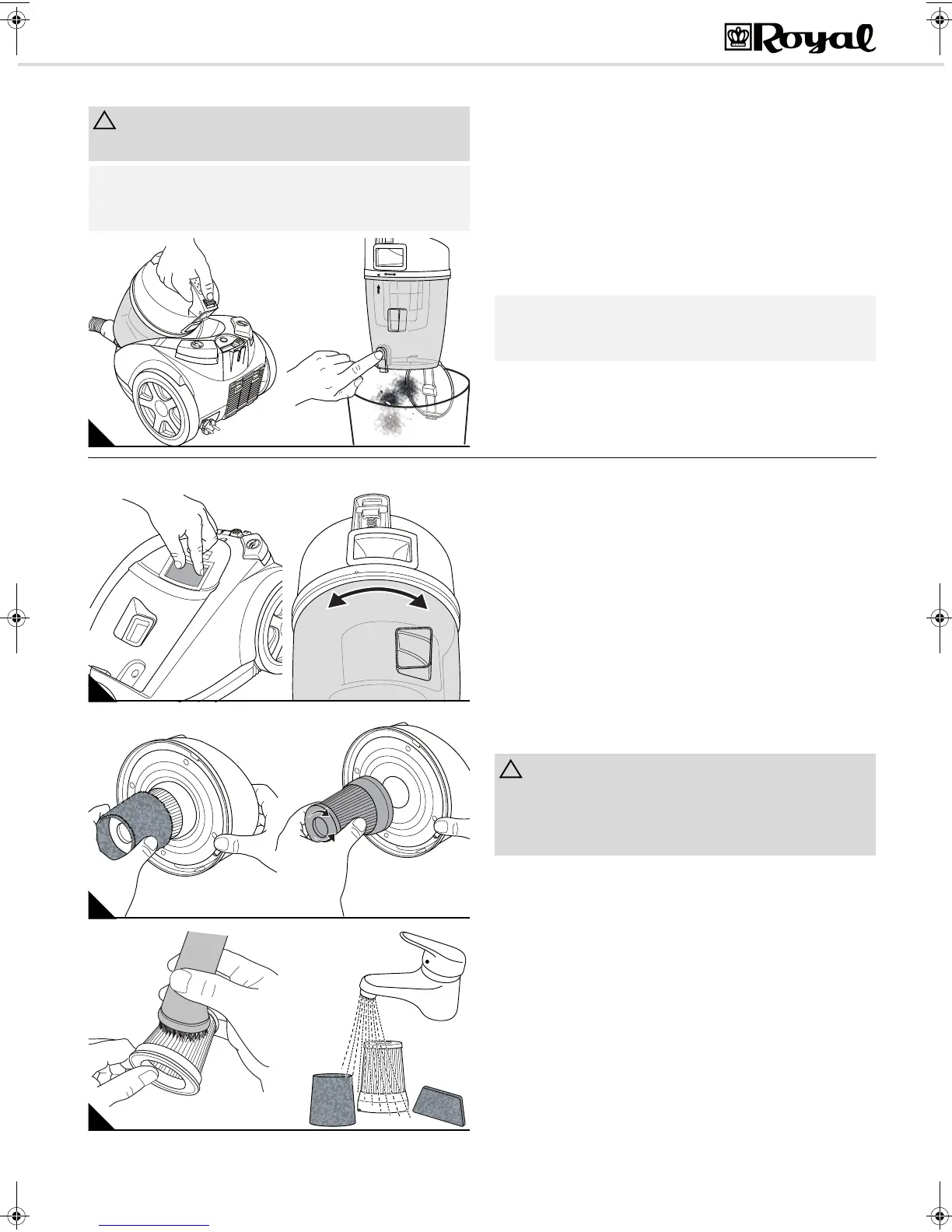 2. Remove and empty the dust container, Zchapter 5.1, „Emptying and