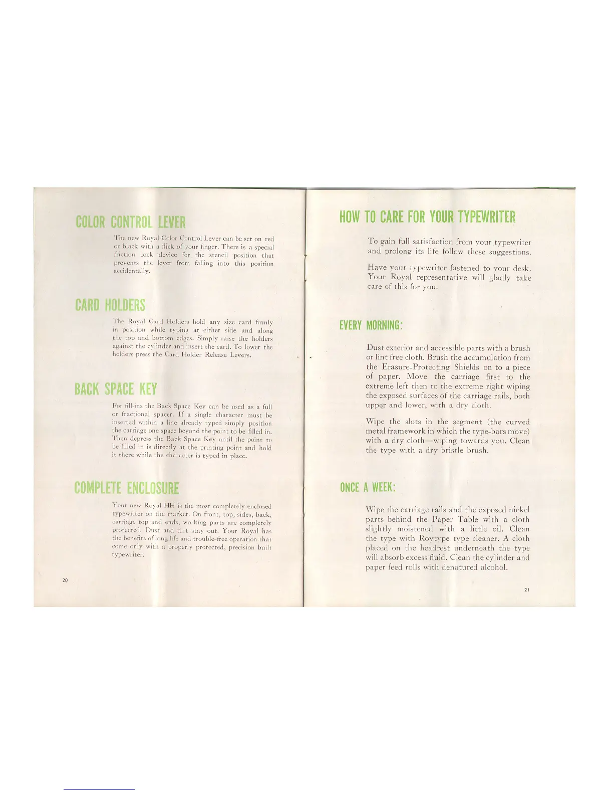 Royal HH - Typewriter Care and Usage; Color Control and Card Holders; Complete Enclosure; How to Care for Your Typewriter