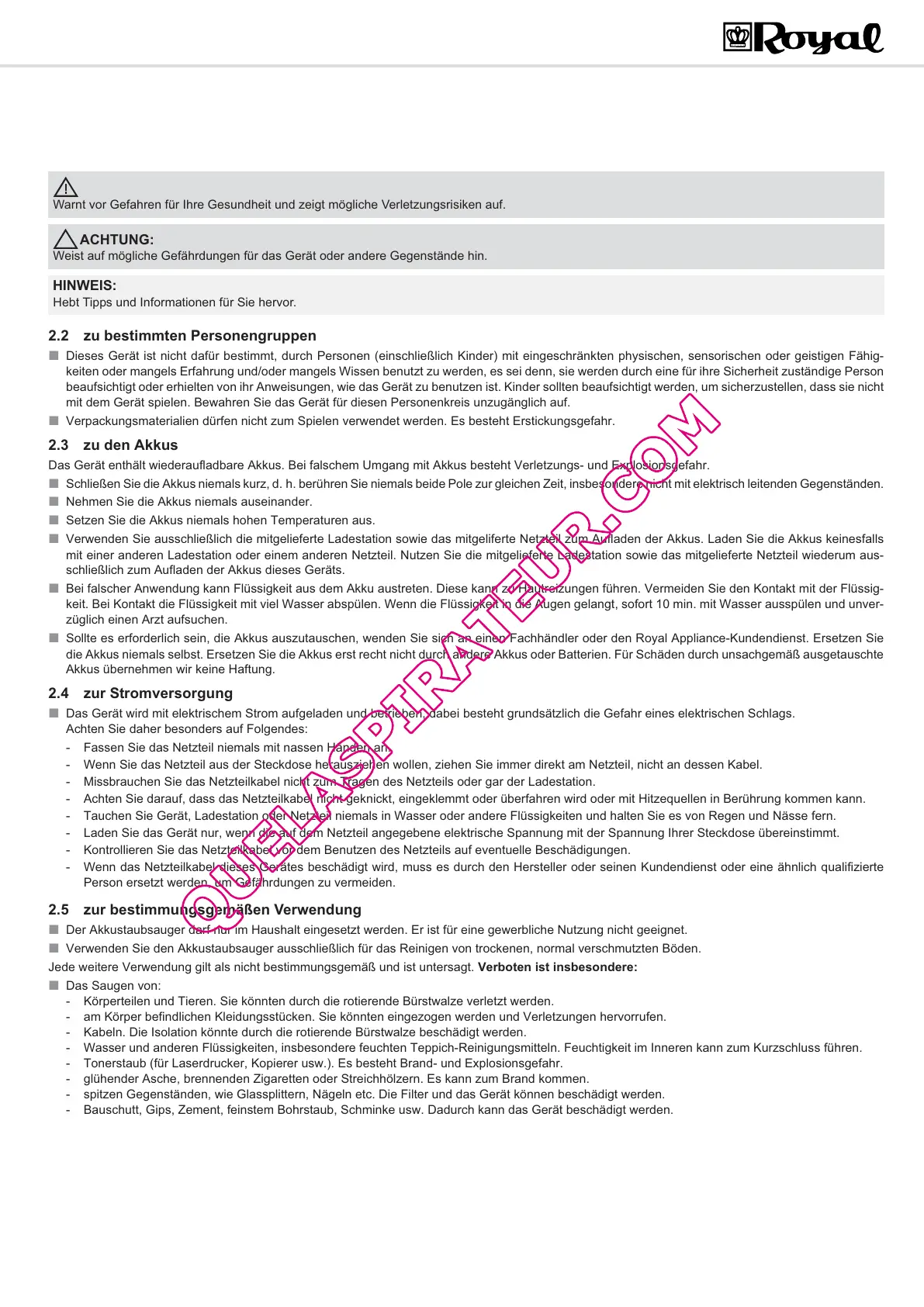 Der Akkustaubsauger darf nur im Haushalt eingesetzt werden. Er ist für eine gewerbliche Nutzung nicht geeignet.