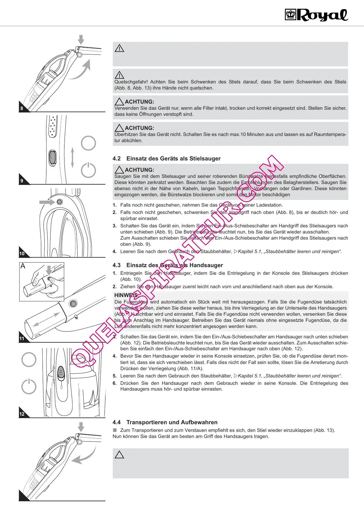 Saugen Sie mit dem Stielsauger und seiner rotierenden Bürstwalze keinesfalls empfindliche Oberflächen.