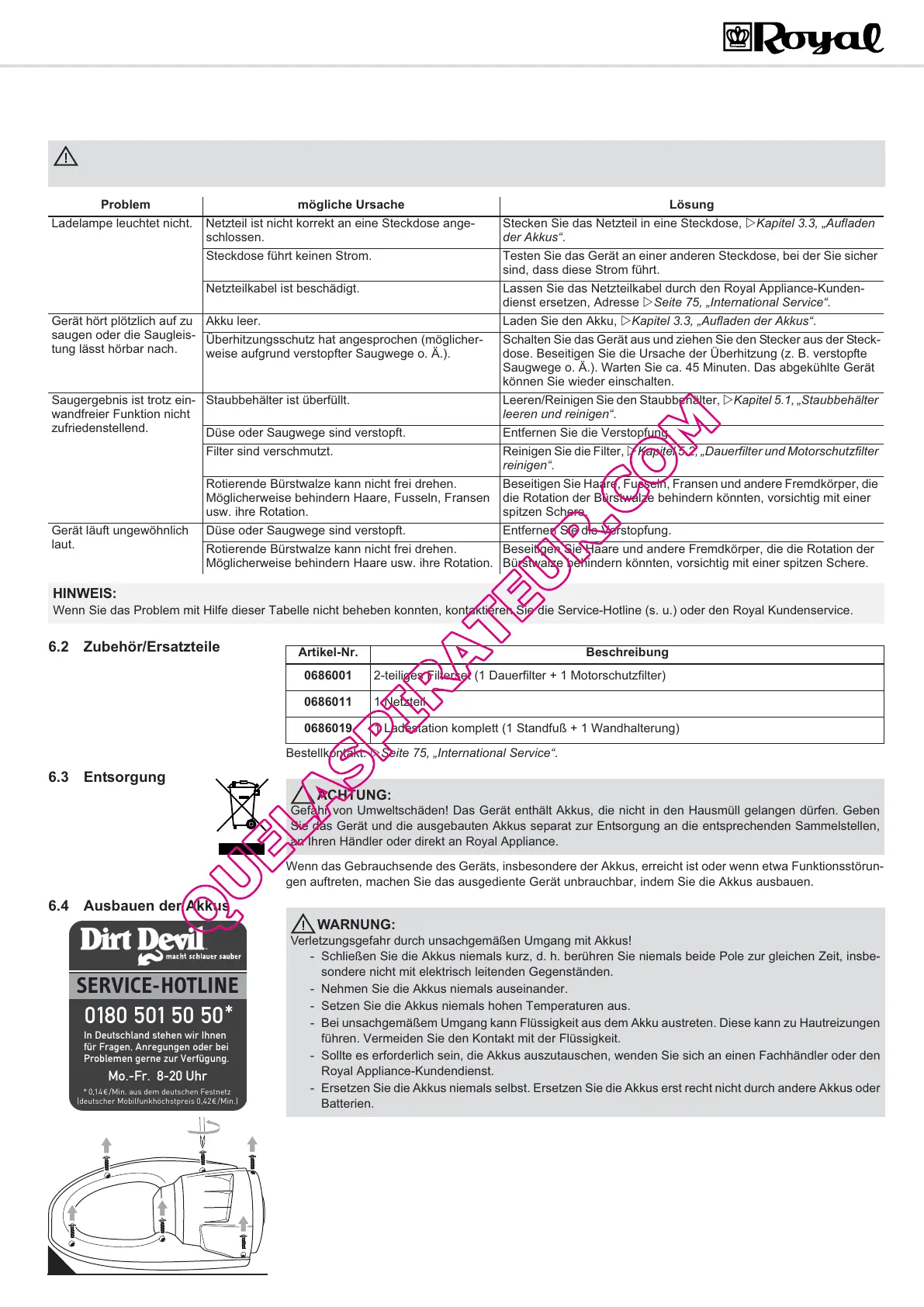 Wenn Sie das Problem mit Hilfe dieser Tabelle nicht beheben konnten, kontaktieren Sie die Service-Hotline (s. u.) oder den Royal Kundenservice.