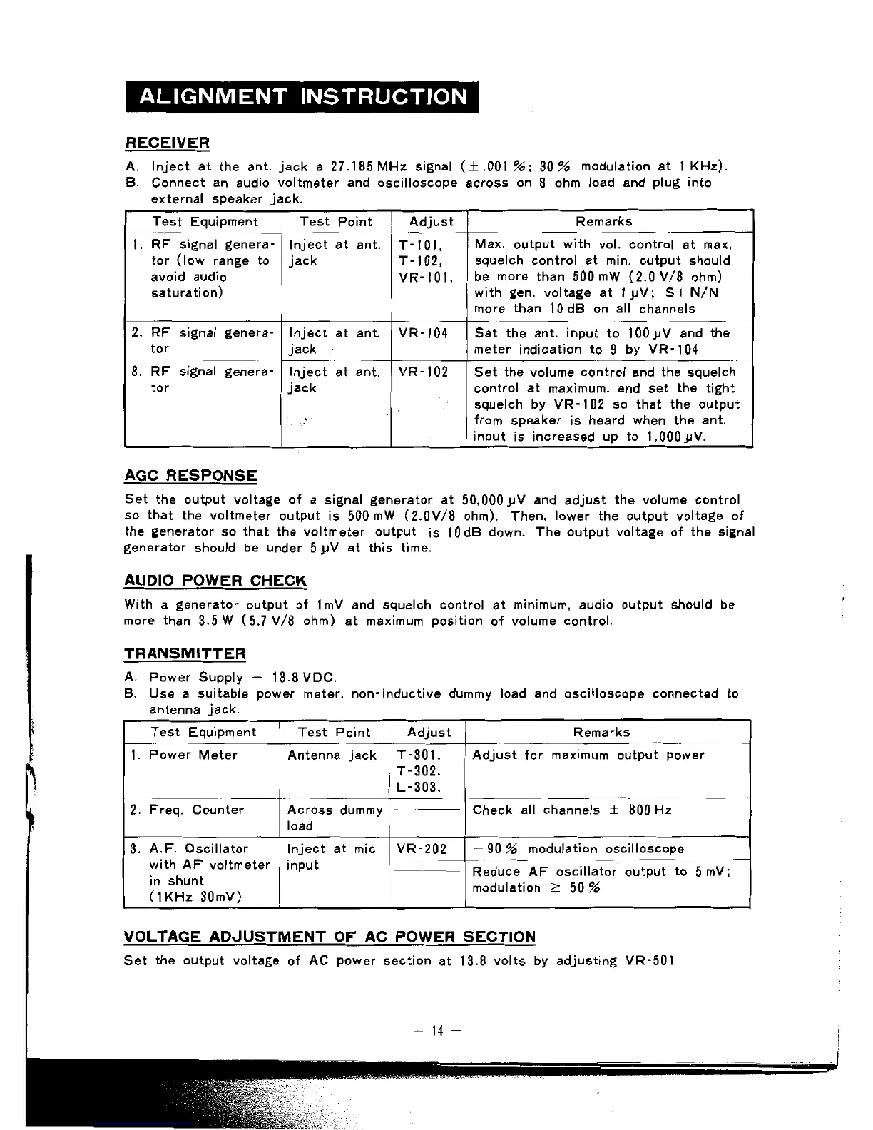 Royce 619 - ALIGNMENT INSTRUCTIONS; Receiver Alignment Procedures; Transmitter Alignment Procedures
