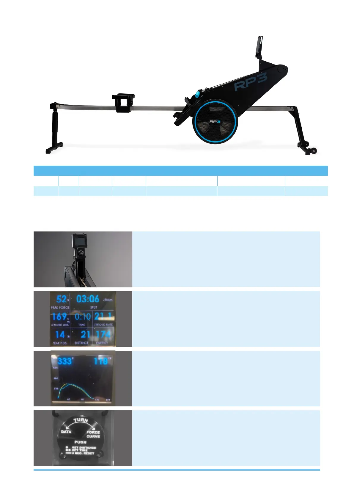 Track distance, peak force, pace, stroke length, stroke rate,