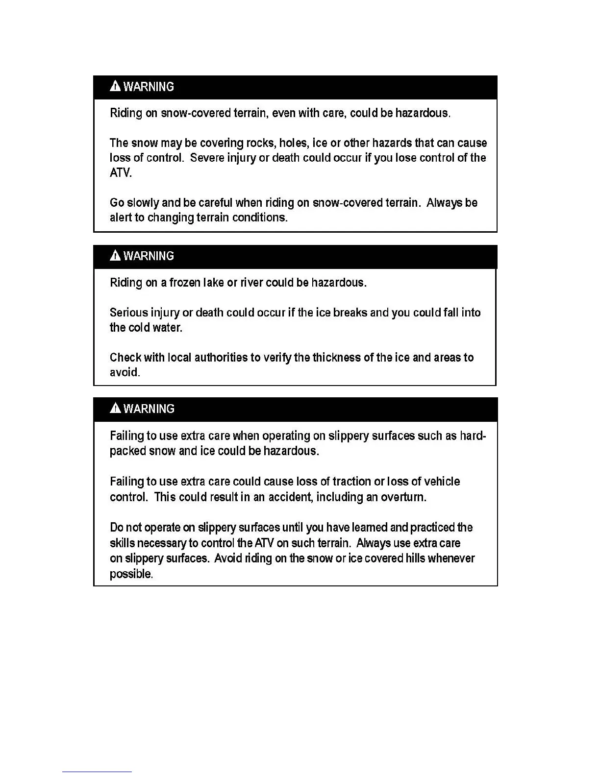 Practice riding your ATV in an open snow- or ice-covered area, at slow speeds, before