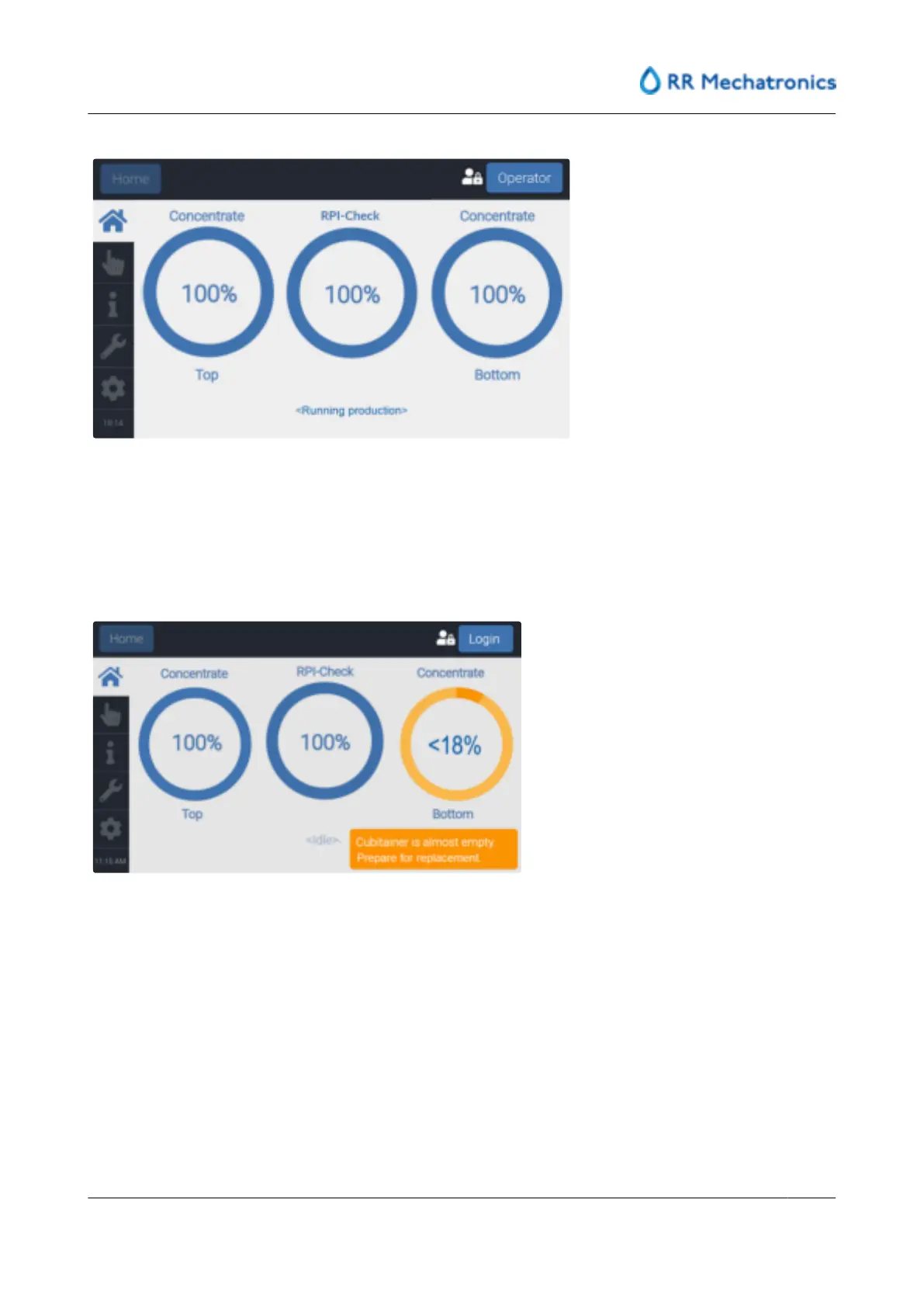 The color changes to red when a cubitainer is empty (<5%), production switches to other cubitainer and an