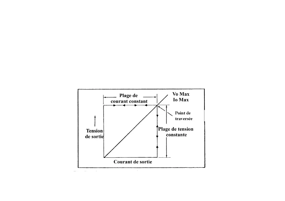 L’intensité de sortie devient alors constante, et la tension baisse en proportion de l’augmentation subséquente de la charge. Le