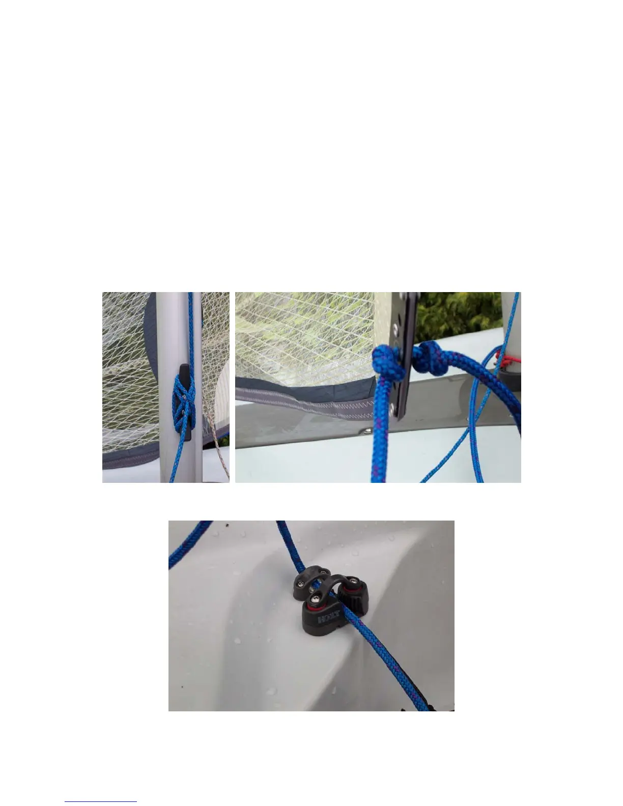 8) Take one of the jib sheet ends and pass it through the bullseye and jib cleat,