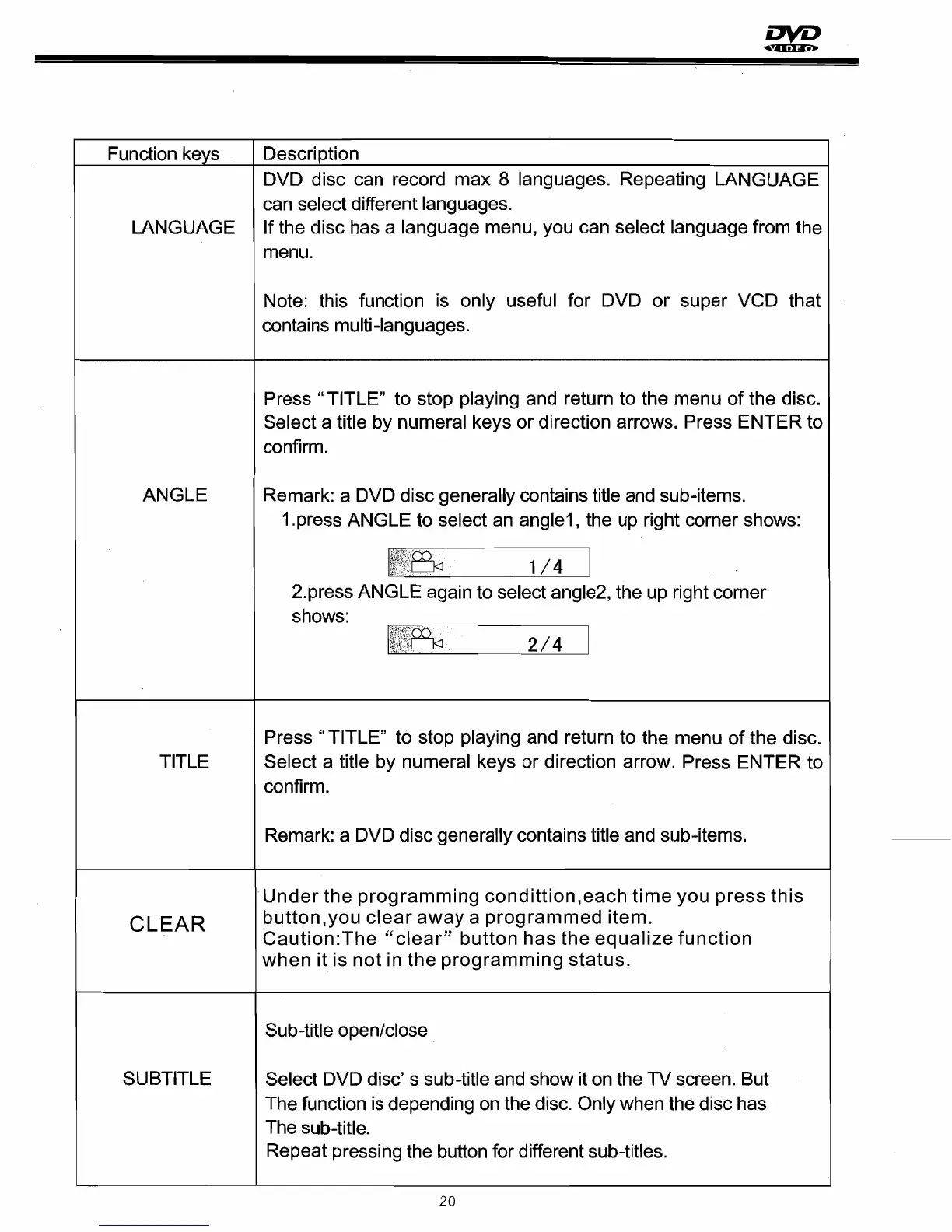 RSQ NEO-E500 - Remote Control Disc and System Controls; Angle, Title, Clear, Subtitle, and Video Controls