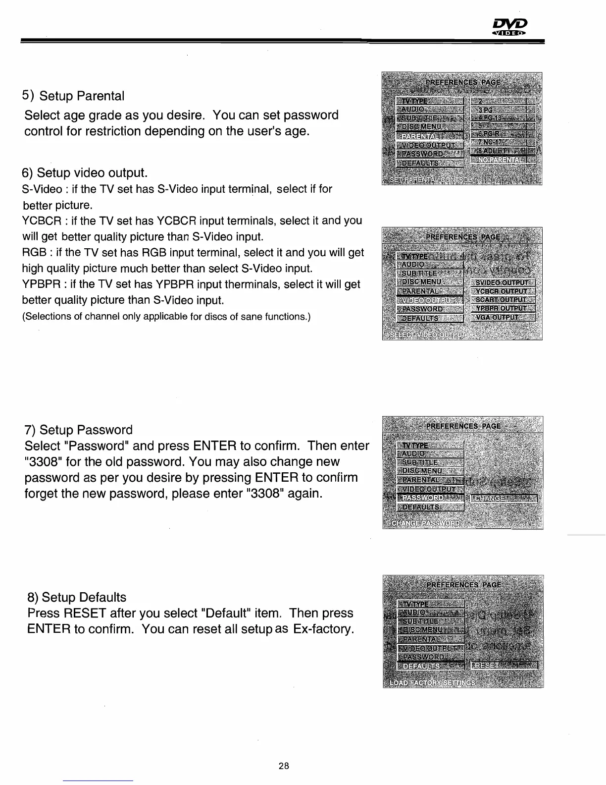 RSQ NEO-E500 - Preference Settings Configuration; Parental Control and Video Output Settings; Password and Default Settings