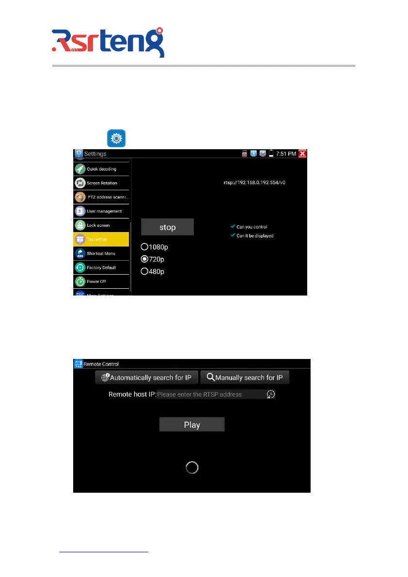 phone, Tap icon " ", select "TesterPlay" app, Click "Start" will create the RTSP URL.