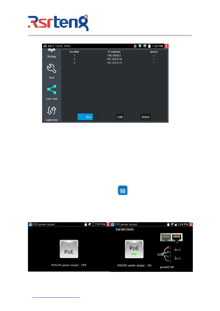 Supports PoE, the PoE power is delivered via pins 1, 2, 3, and 6 on the LAN port. The IP tester will