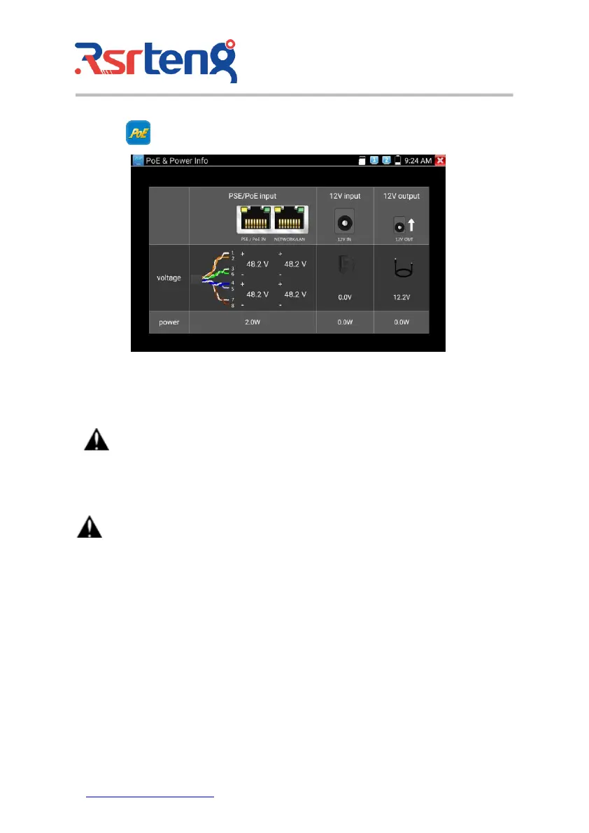 When PoE / PSE voltage testing, PoE/PSE conntect to the tester's PSE "IN" port, the camera connect to