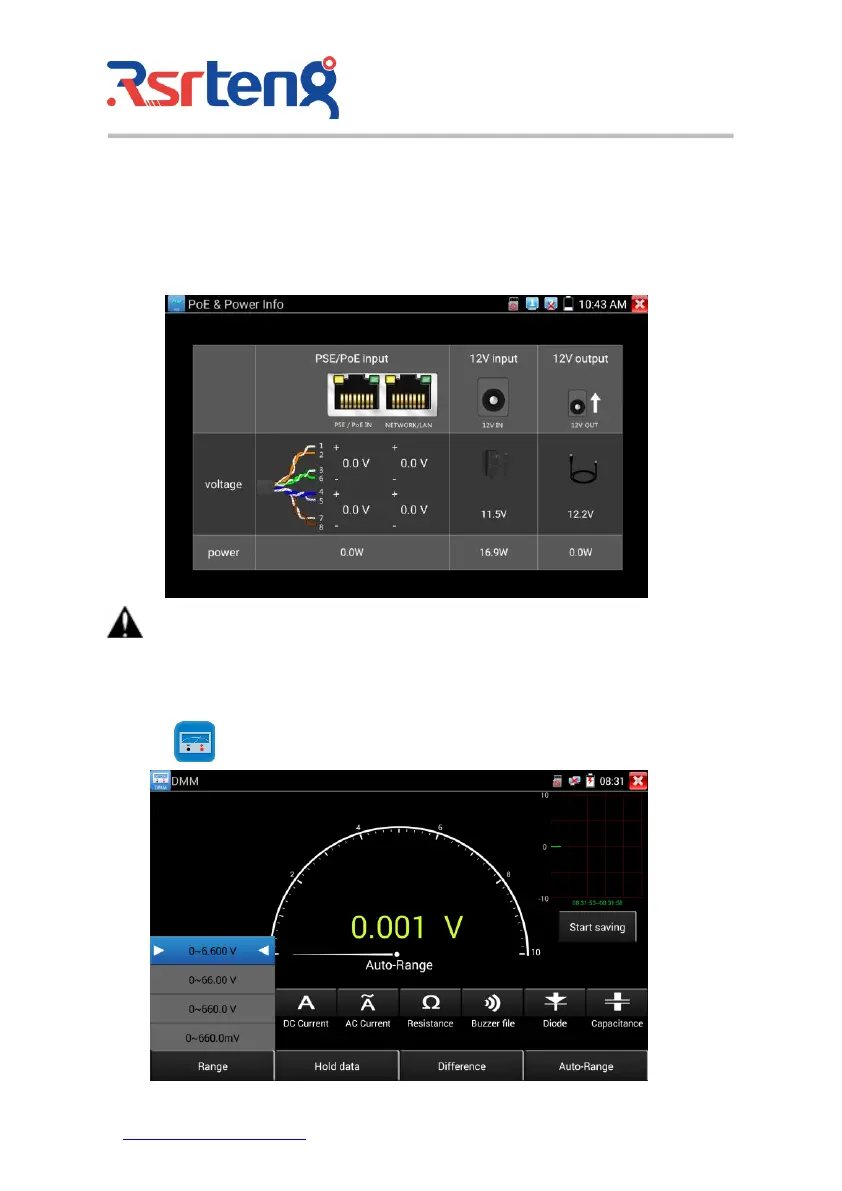 Connect 12V power adaptor to tester's charging port, then click icon "PoE" to enter voltage