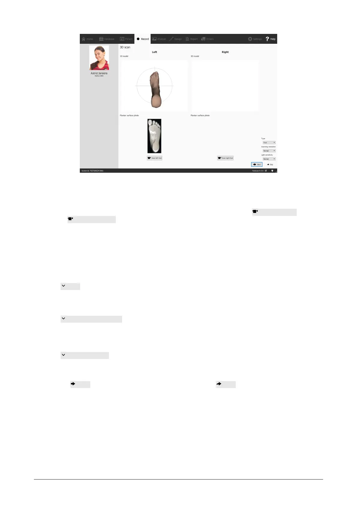 performed on each foot separately and can be initiated by clicking the Scan left foot