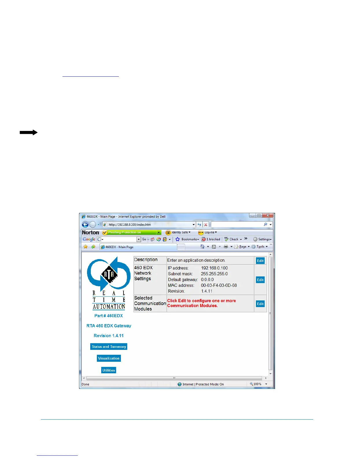 The RTA 460 Gateway Main Page displays. See Figure 2-2.