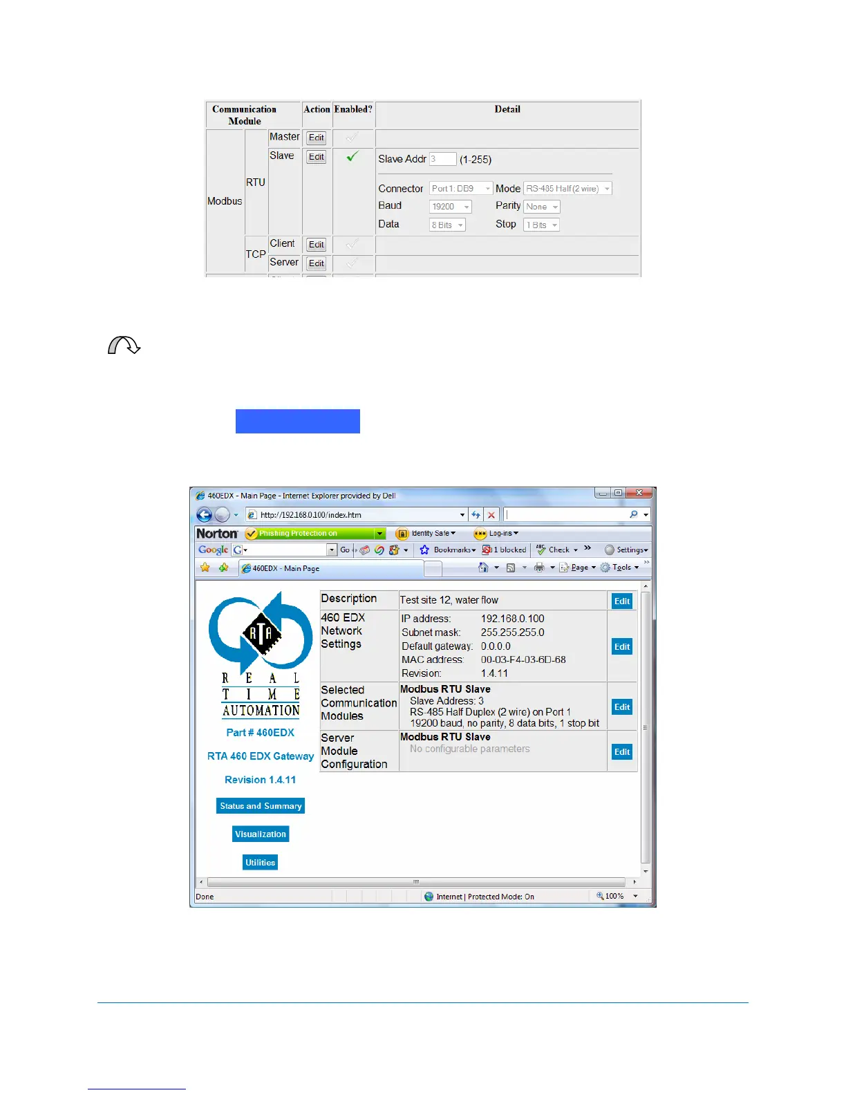 6. Click on the button. The RTA 460 Gateway Main Page displays with