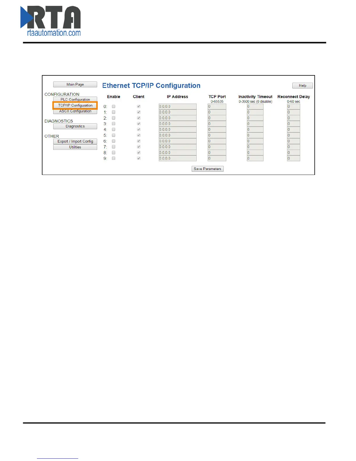 1) From any page, click the TCP/IP Configuration button under the CONFIGURATION section.