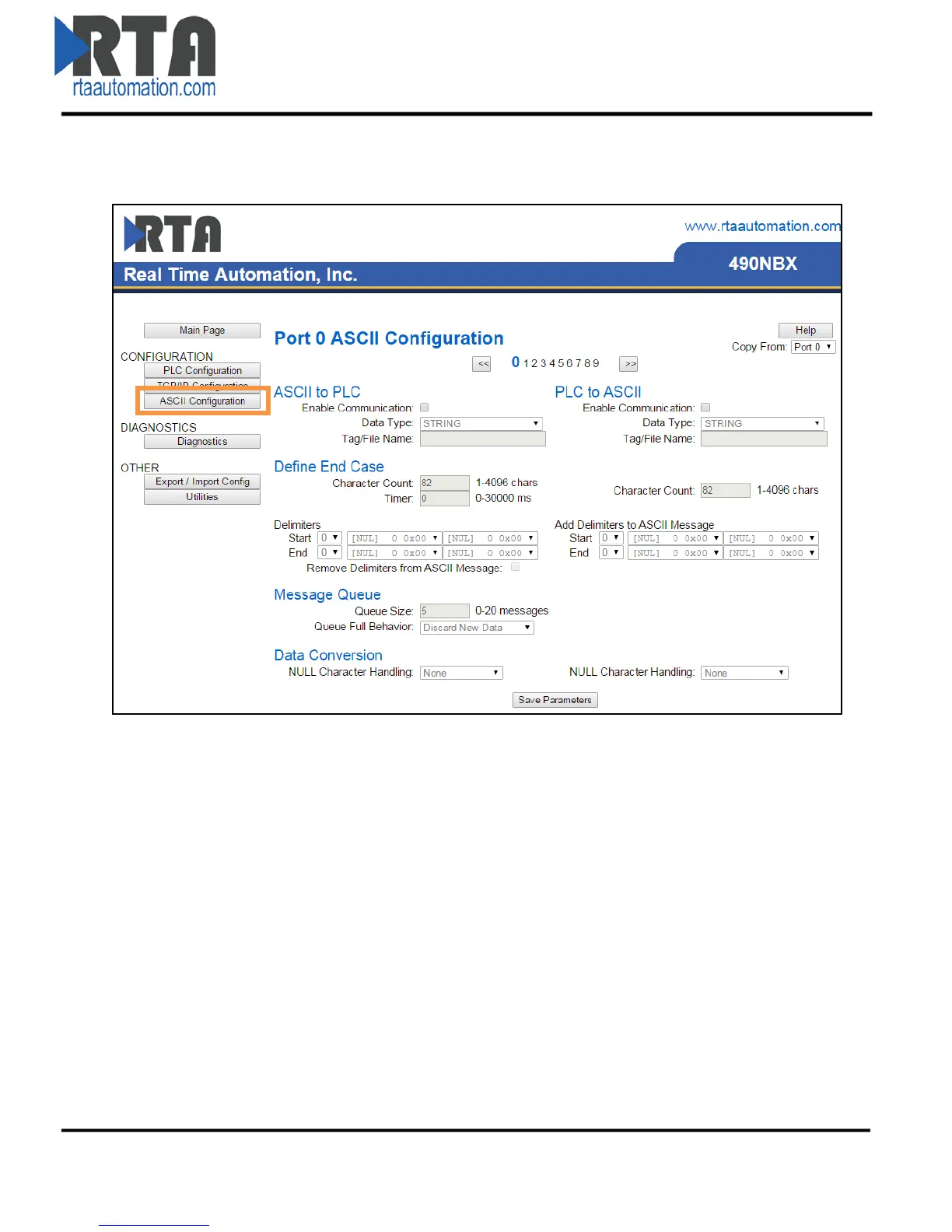1) Click the ASCII Configuration button under the CONFIGURATION section.