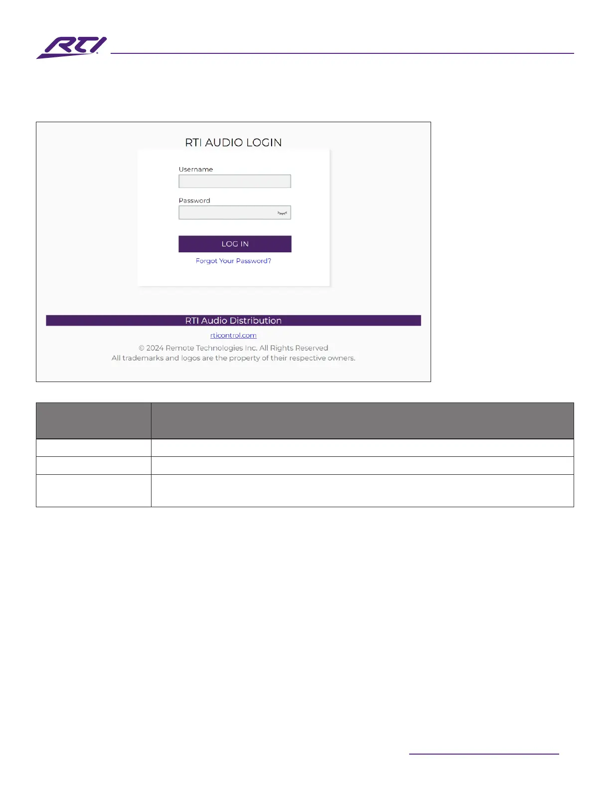 Password Enter the password to access the WEB GUI. The default password is “RTI123”.