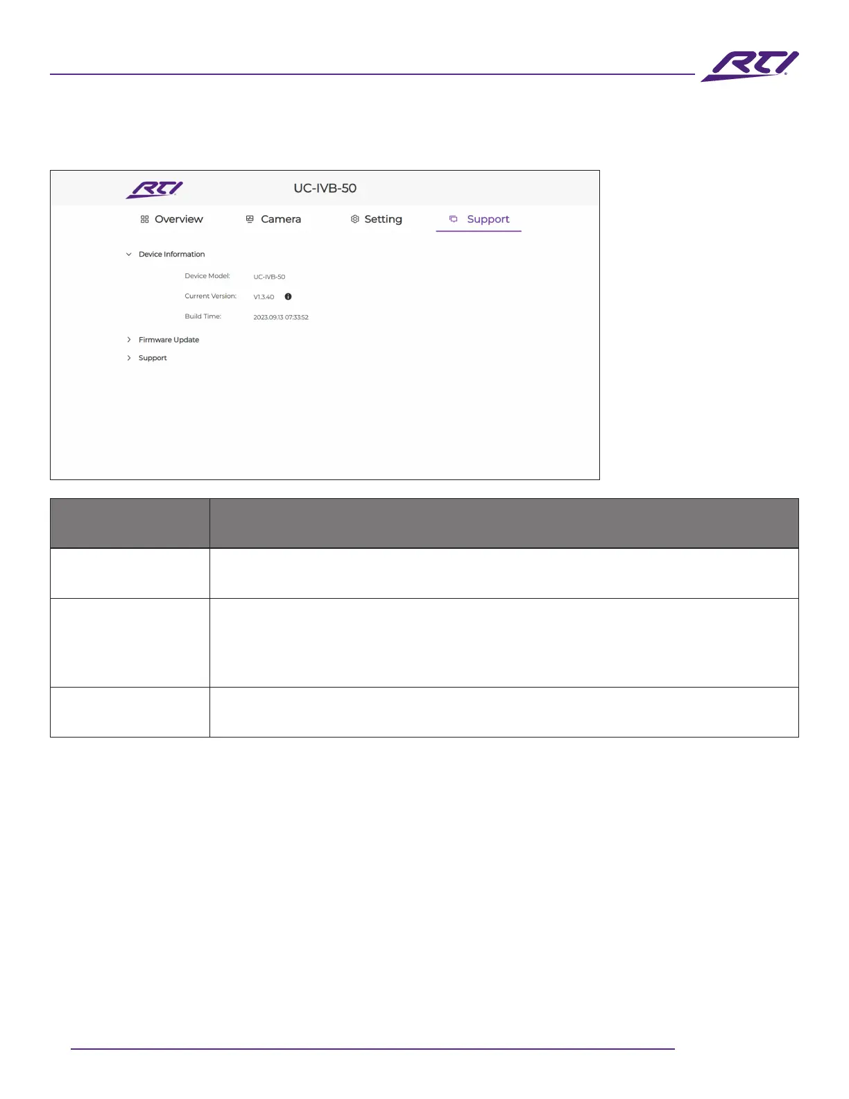 This sections displays the model number, current rmware version, and build