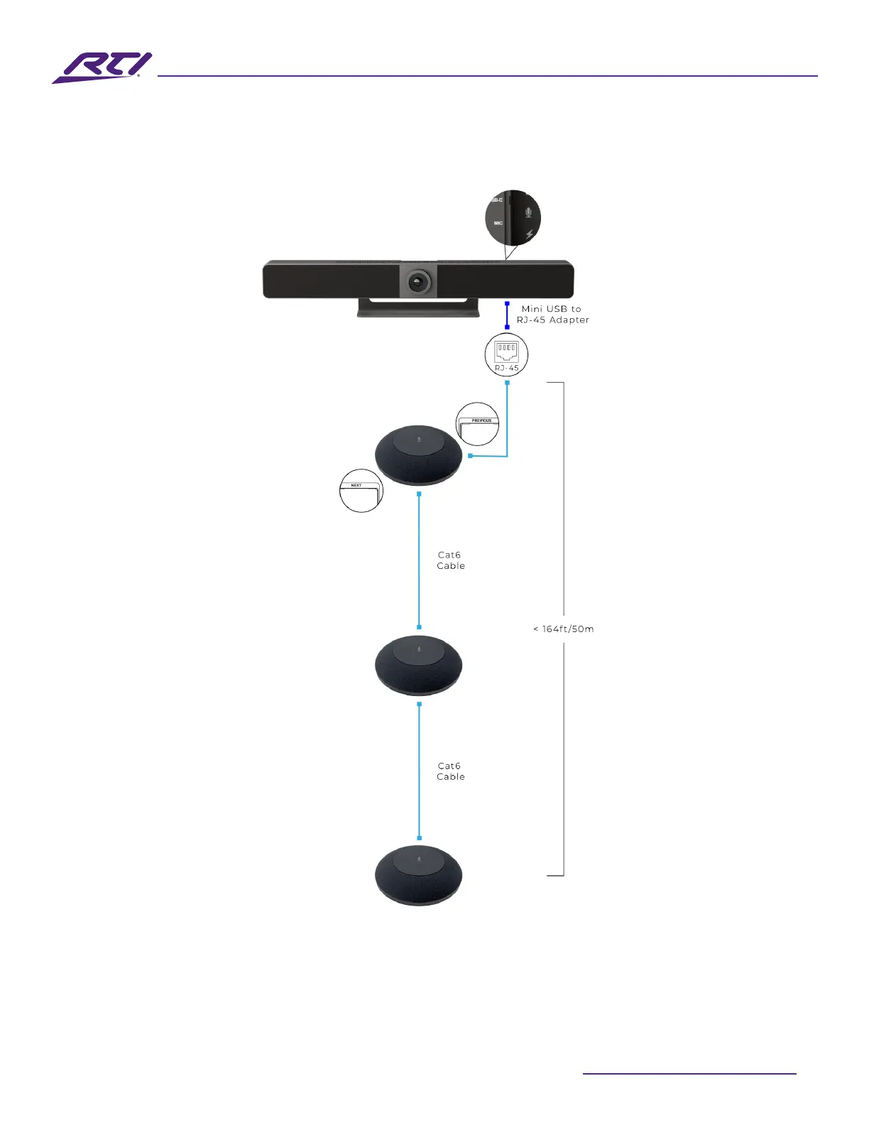 For cascading of up to ve microphones, the total length of all CAT6 cables in use shall not exceed 25