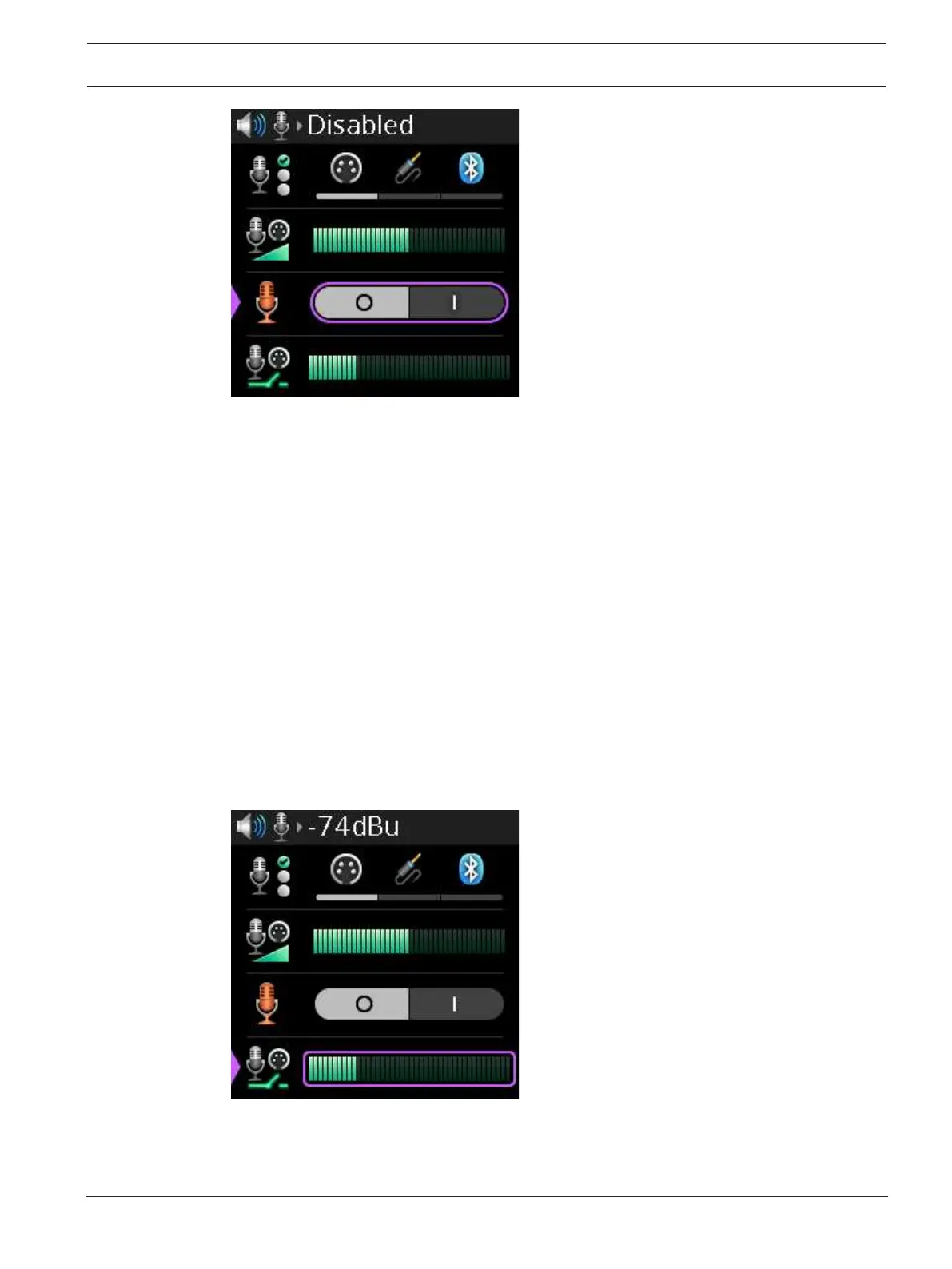 The Noise Gate menu item adjusts the noise gate for the active mic. The Mic Select menu item