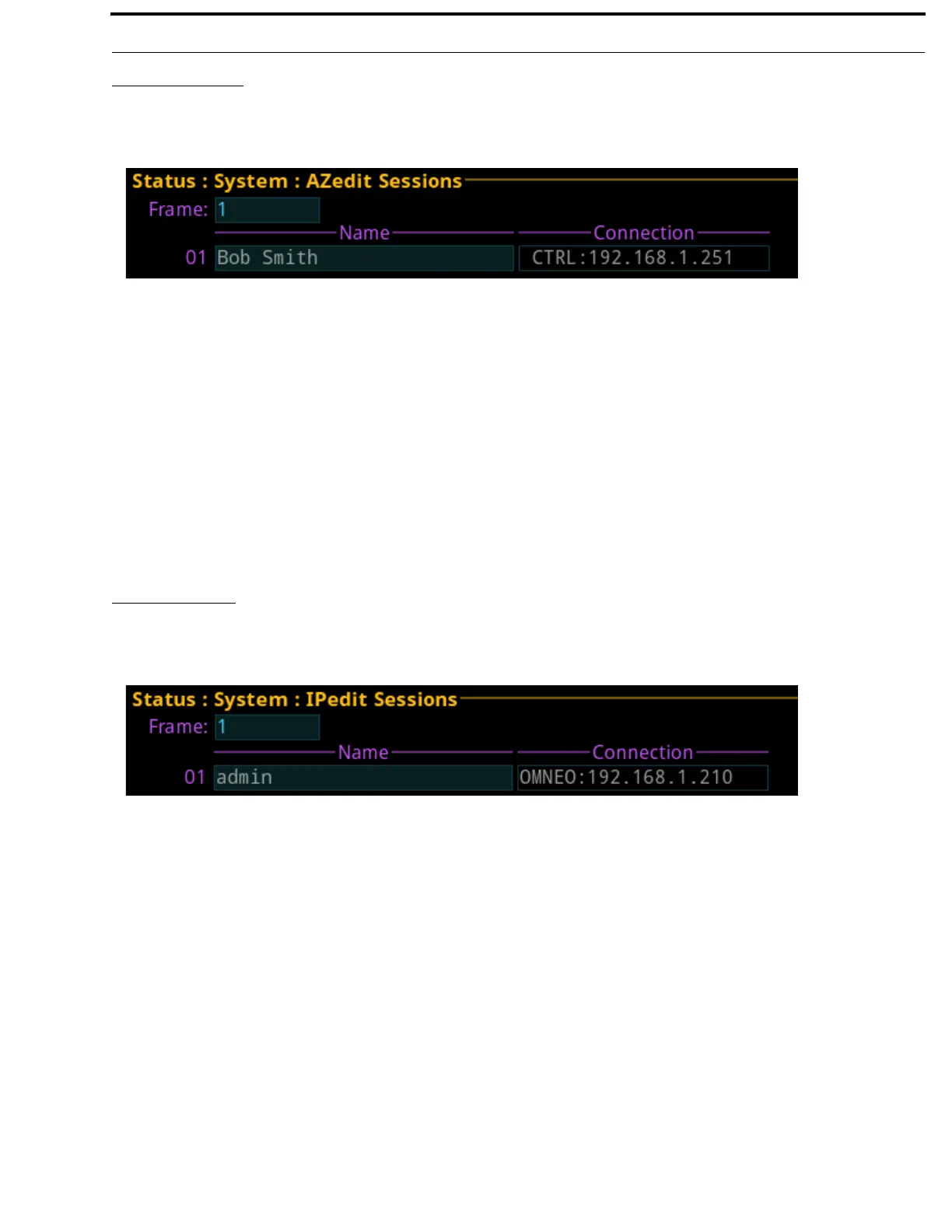 The AZedit Sessions screen displays the user name (login name), if applicable, and network connection (CTRL or MGMT Port) of