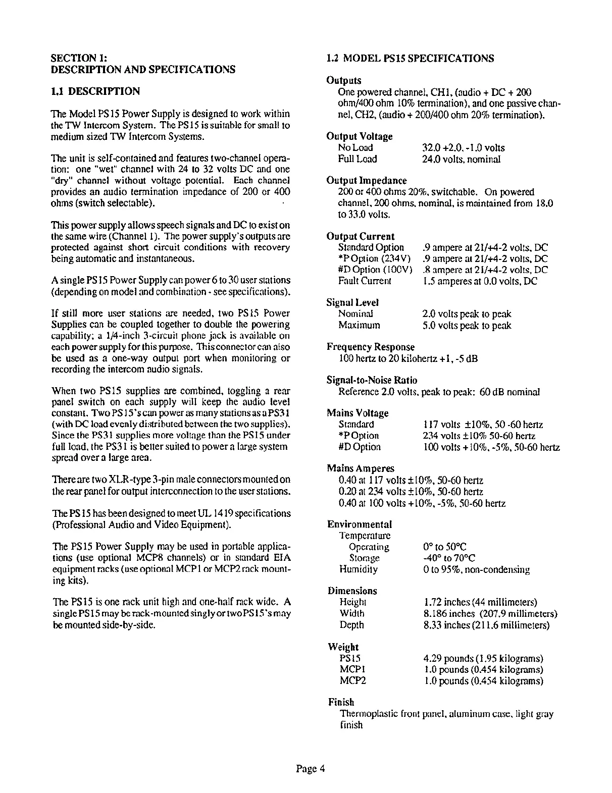 The Model PS 15 Power Supply is designed to work within