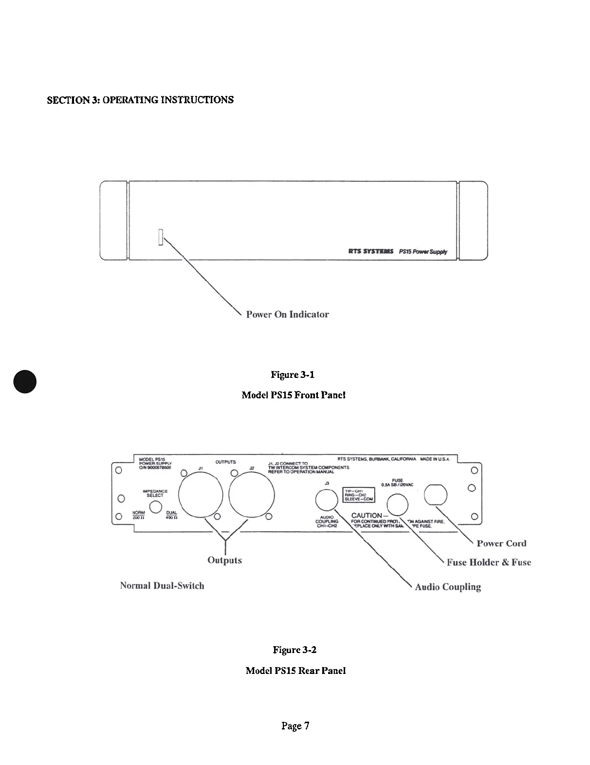 RTS PS-15 - Operating Instructions; Front Panel Controls; Rear Panel Connections