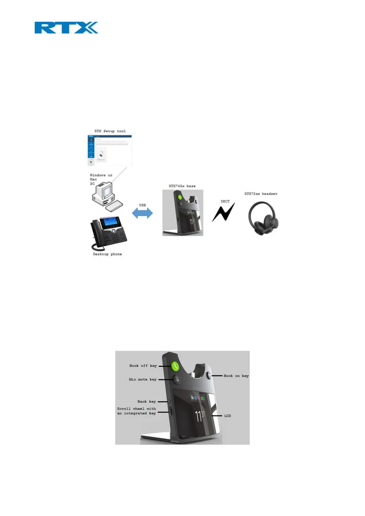 device. The RTX745x base is connected to a host (PC or desktop phone) with USB interface. It acts as a DECT
