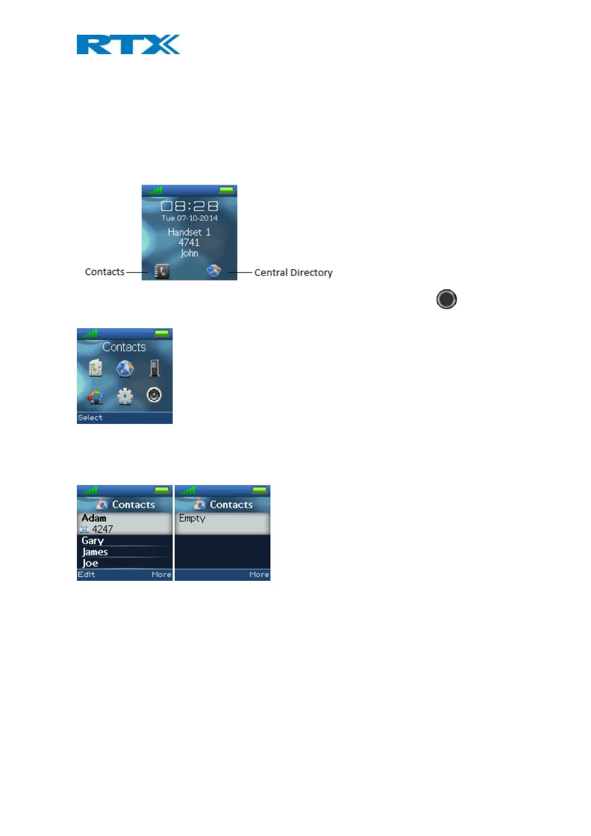 By pressing the left softkey the menu “Contacts” is entered, and by pressing the right softkey “Central Directory”
