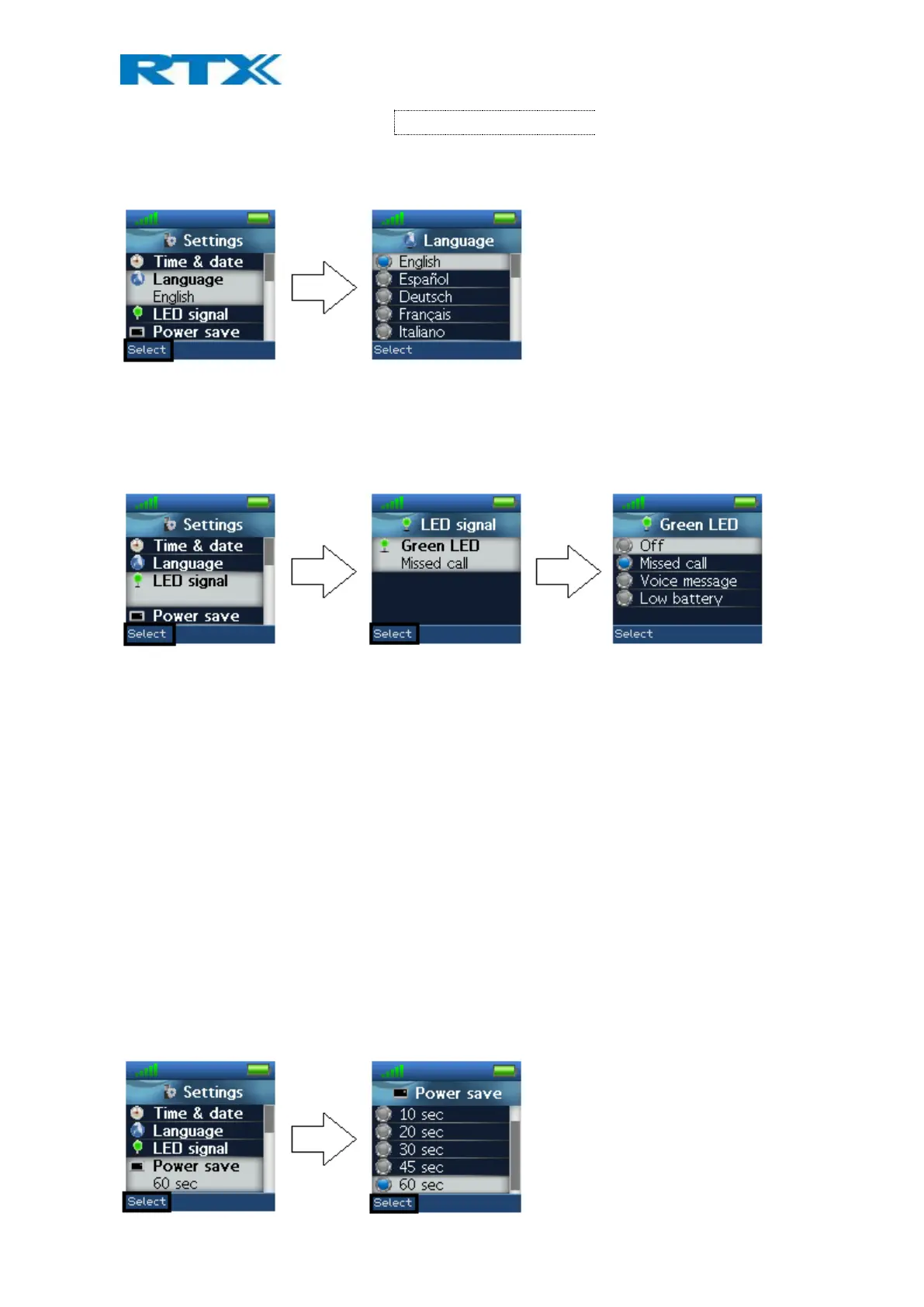When entering this menu, a specific language can be selected by pressing the left softkey “Select”. Scroll through