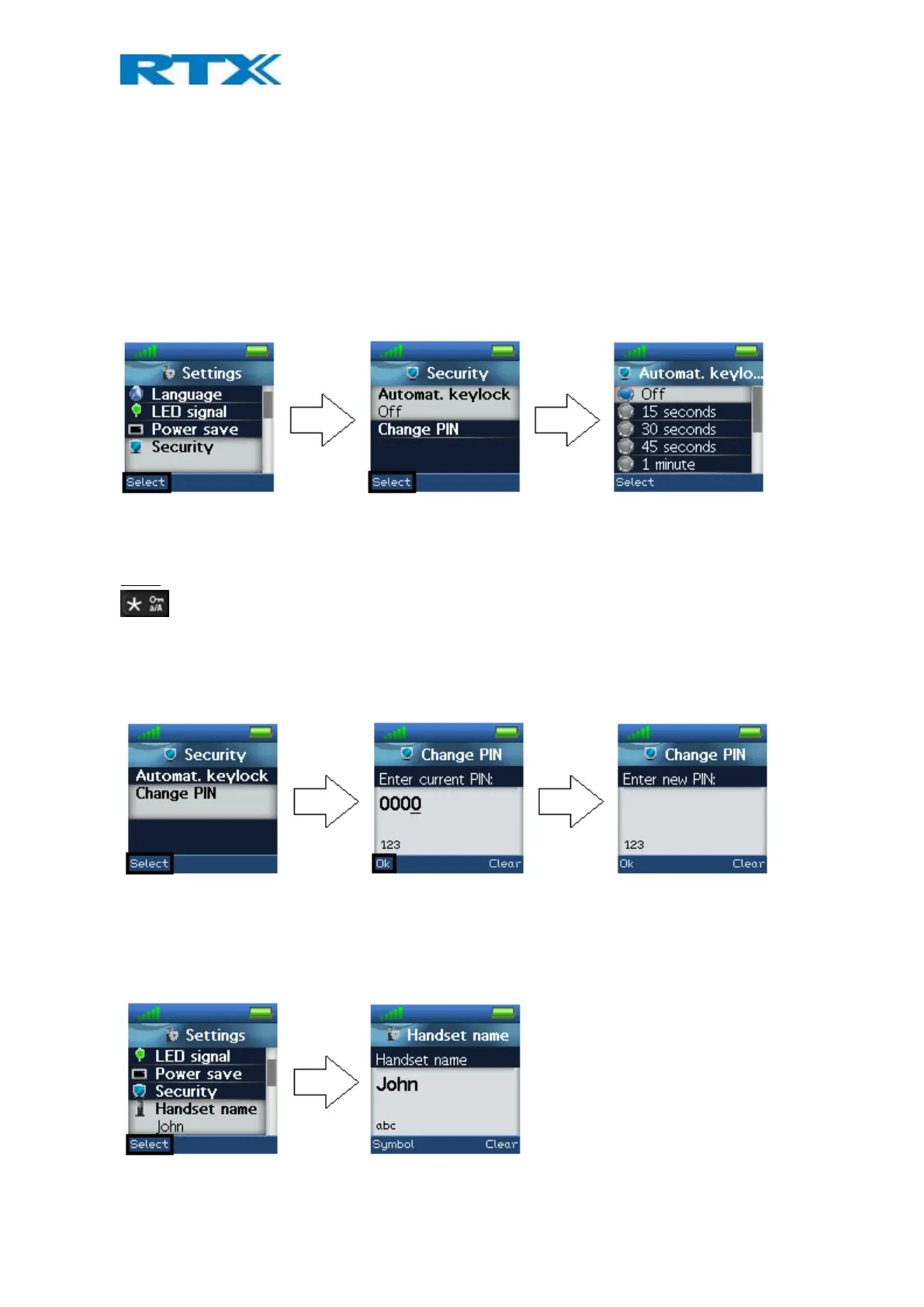 In the “Security” menu it is possible to set an automatic keylock and change the PIN of the handset.