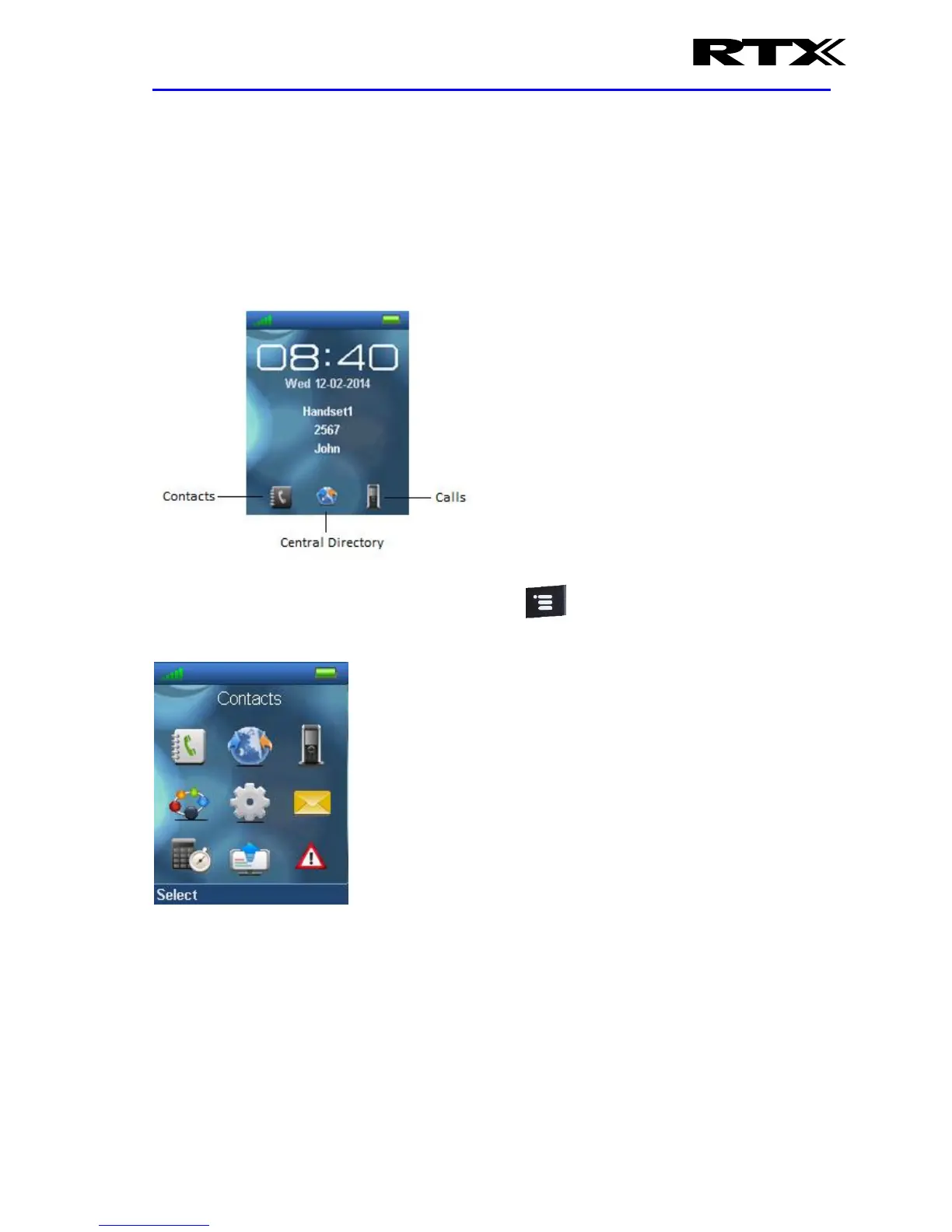 image below. By pressing the left softkey the menu ‘Contacts’ is entered, via the middle softkey
