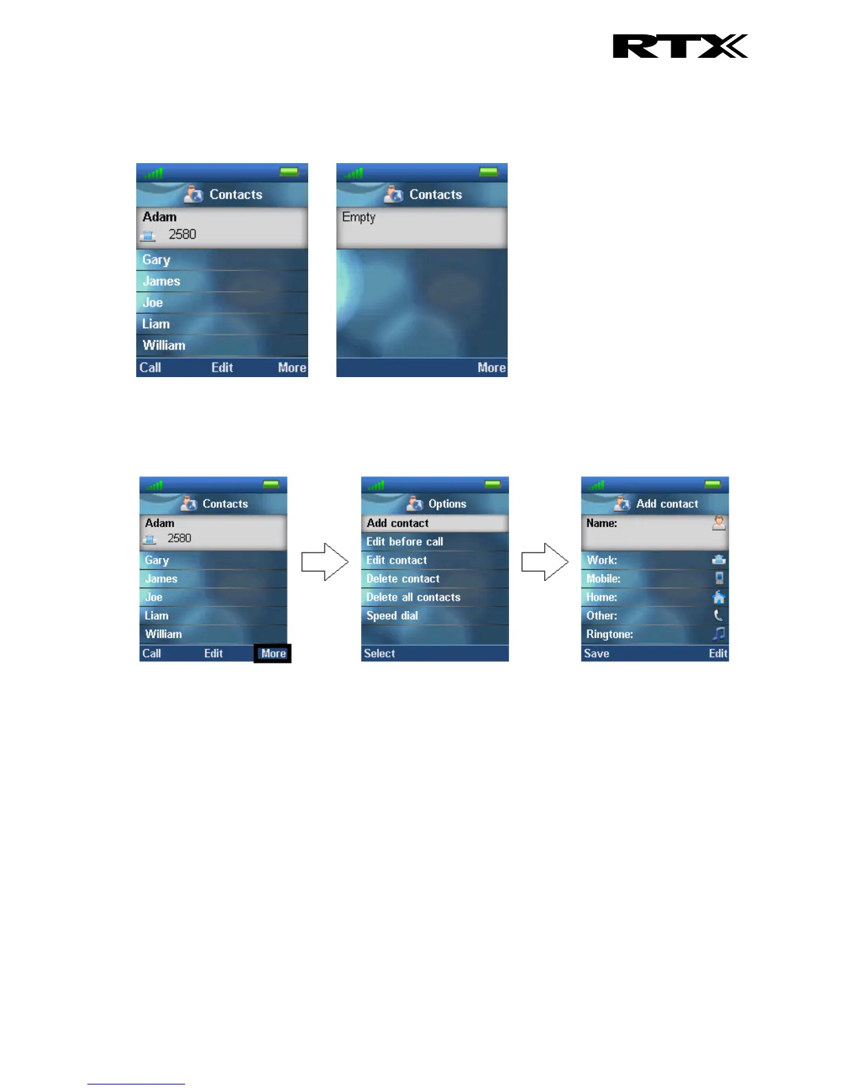 To add a new contact press the right softkey “More”, select “Add contact”, and the information