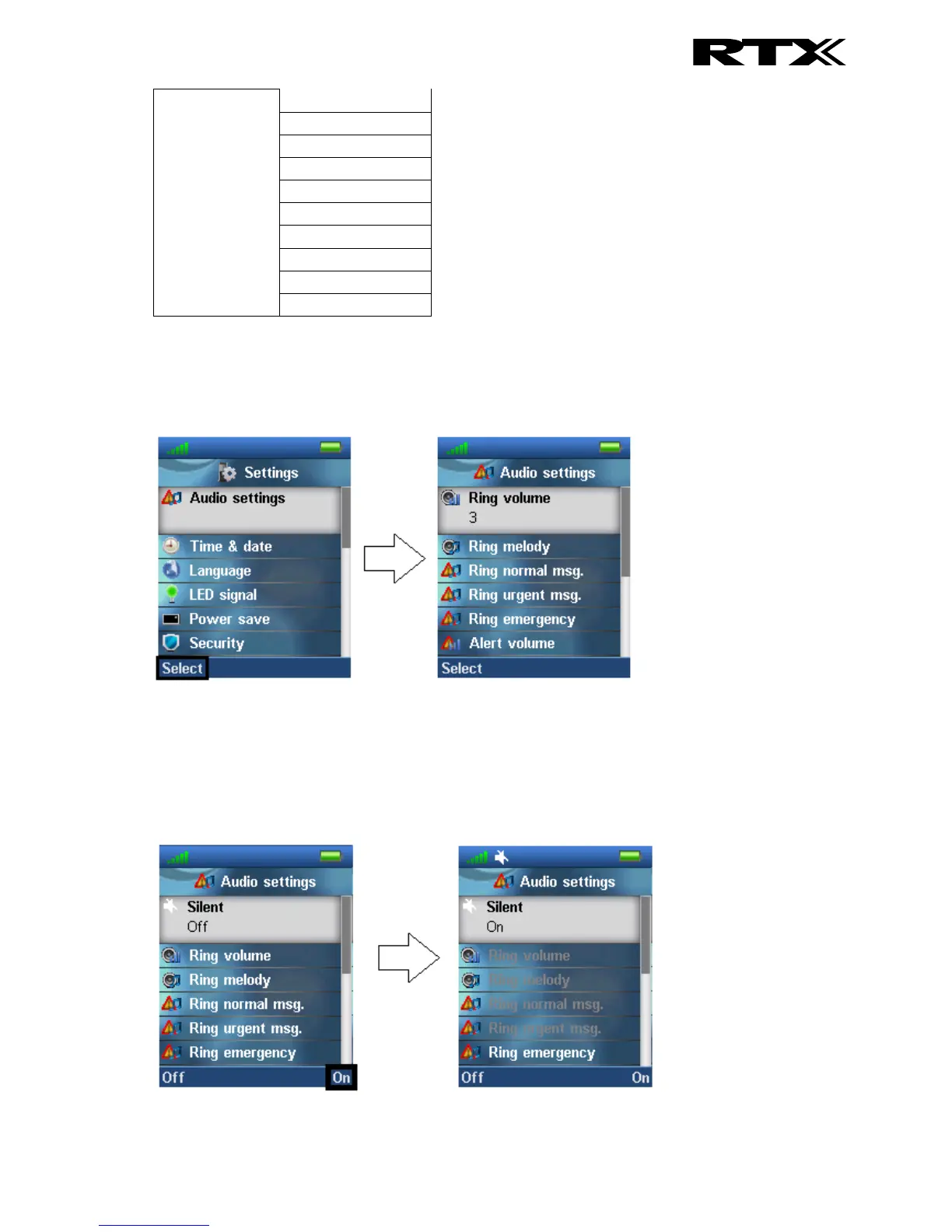 The “Audio settings” menu contains different settings for the sounds on the handset.