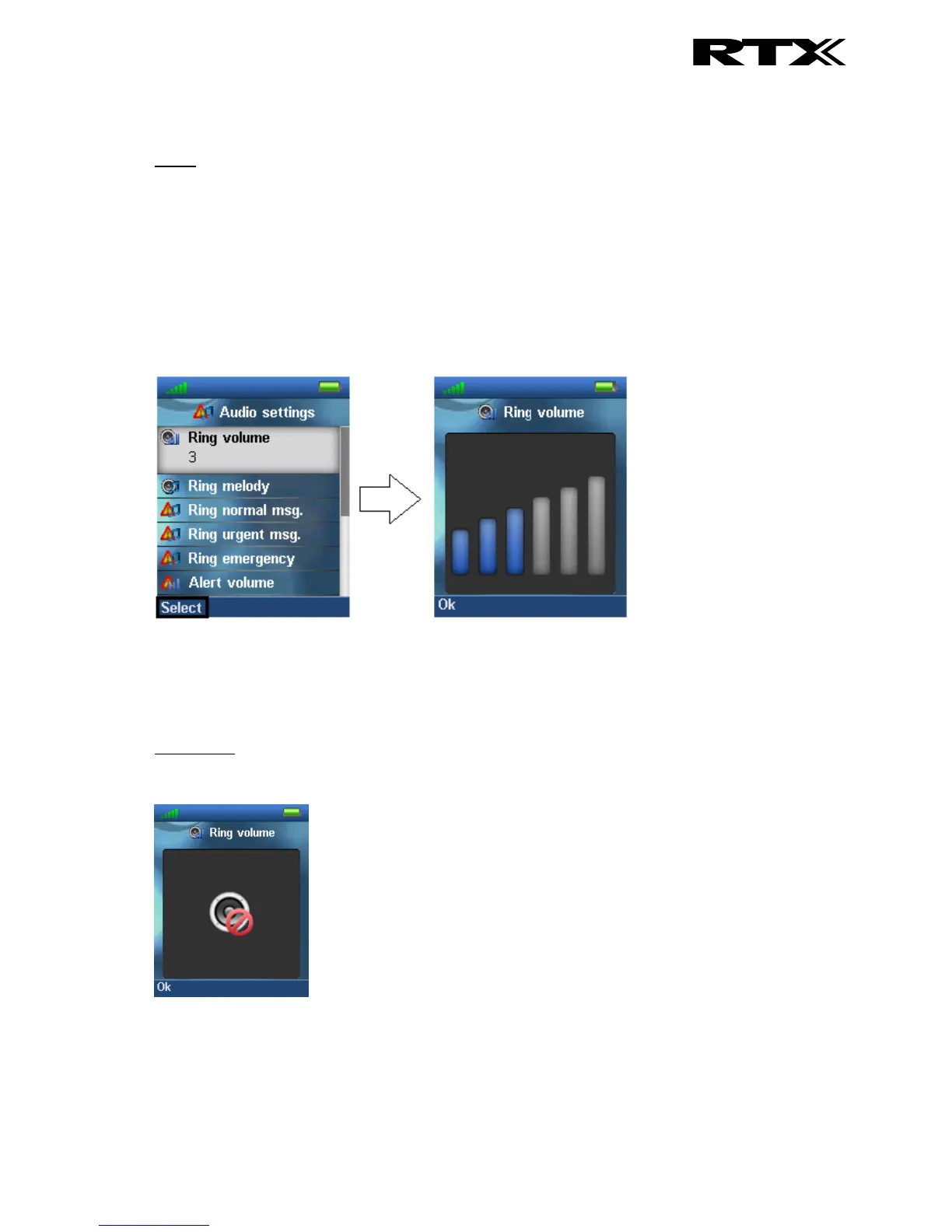 increase or decrease the volume. Thereby, pressing “Ok” saves the current ring volume. The currently