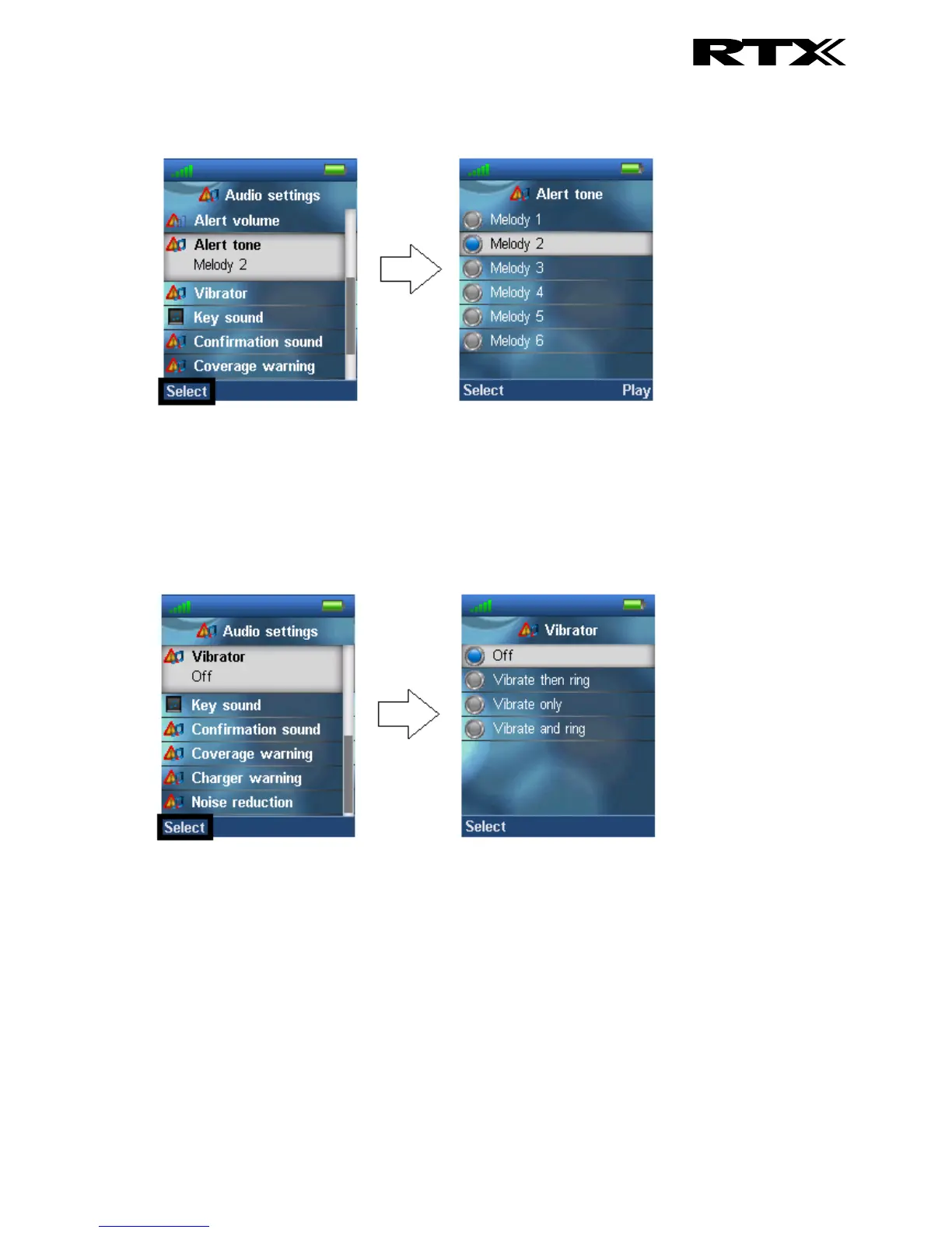 In the vibrator menu different vibrator options can be selected for the handset. The options for the