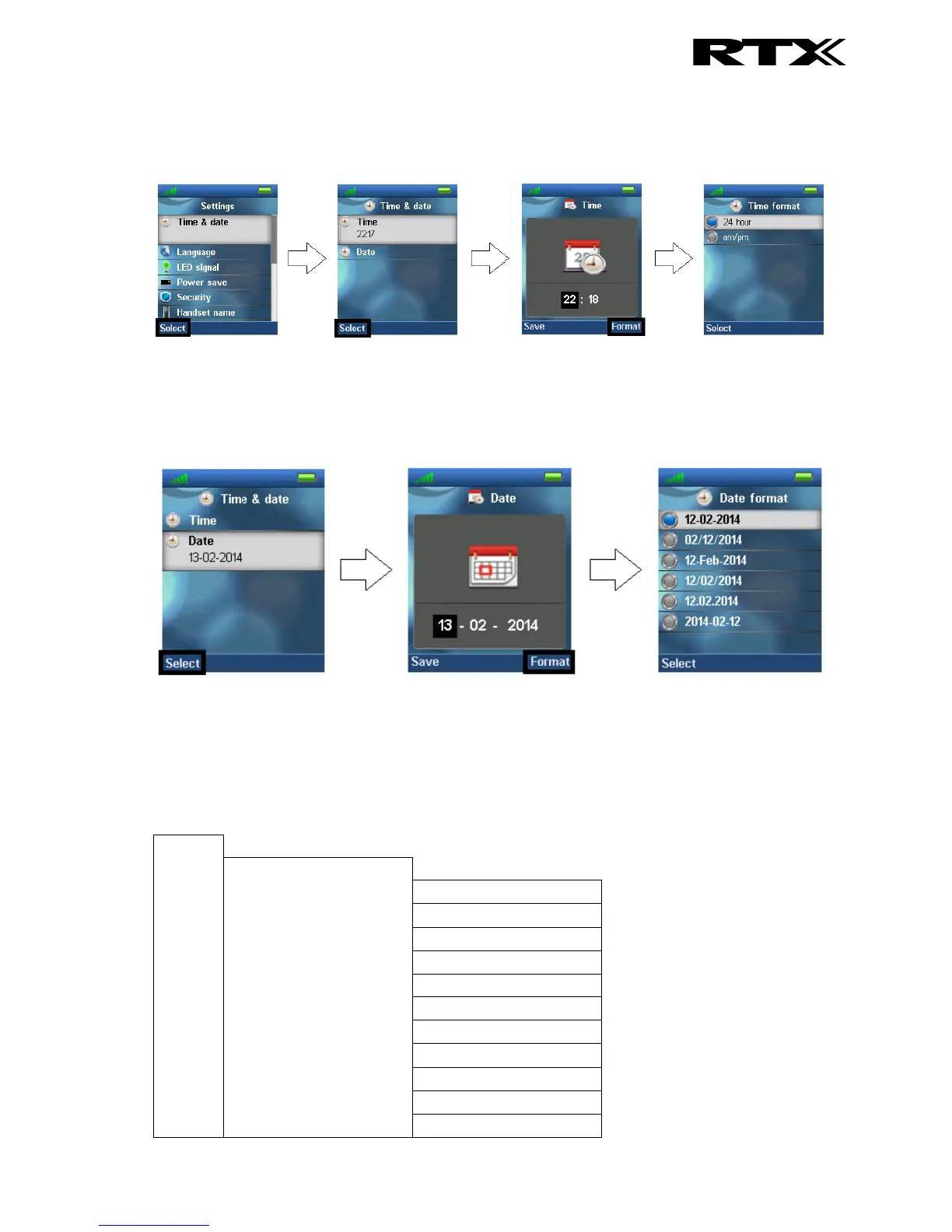 To set the time and date in the handset select the “Time & date” menu. Below it is shown how the