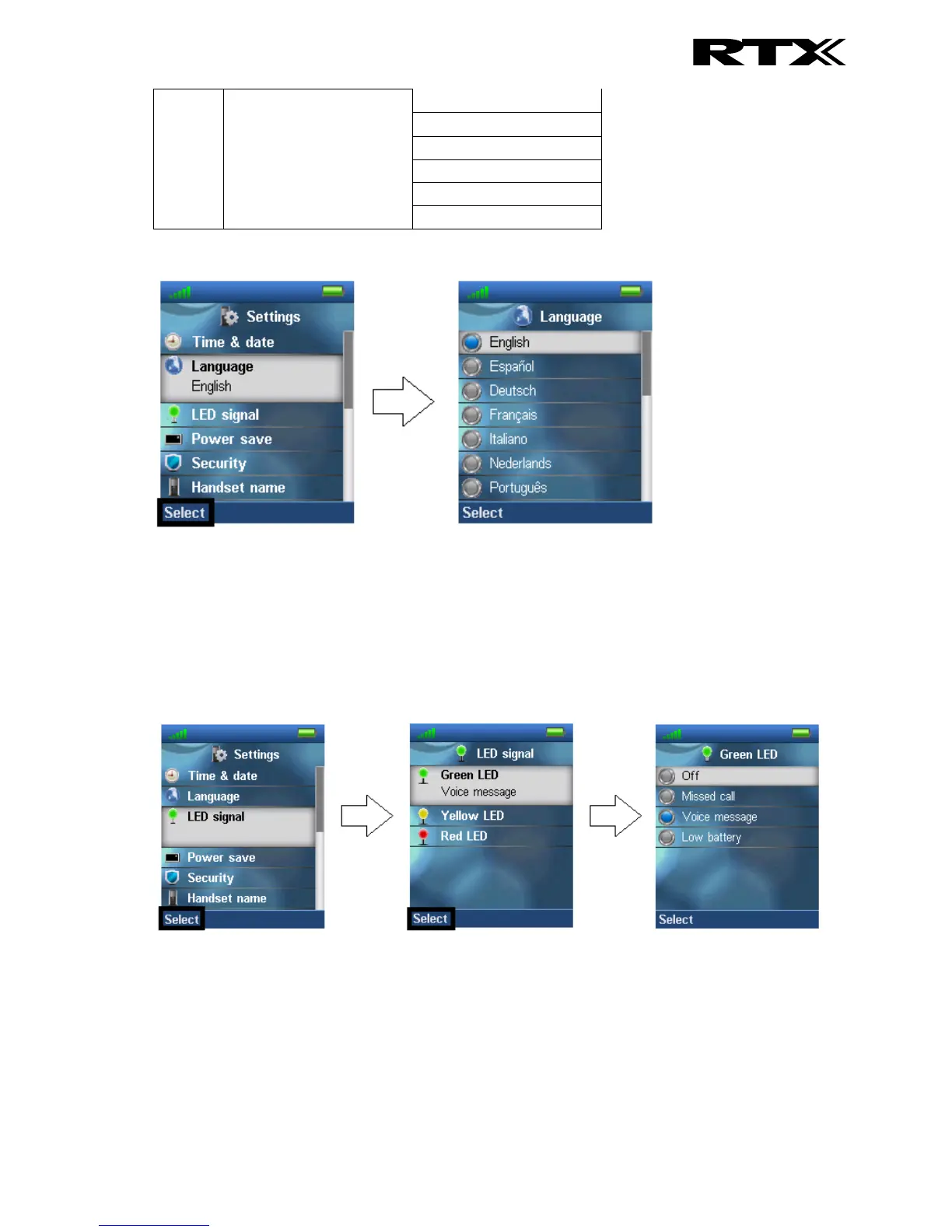 up/down navigation keys, and pressing the left softkey “Select” when the desired language is