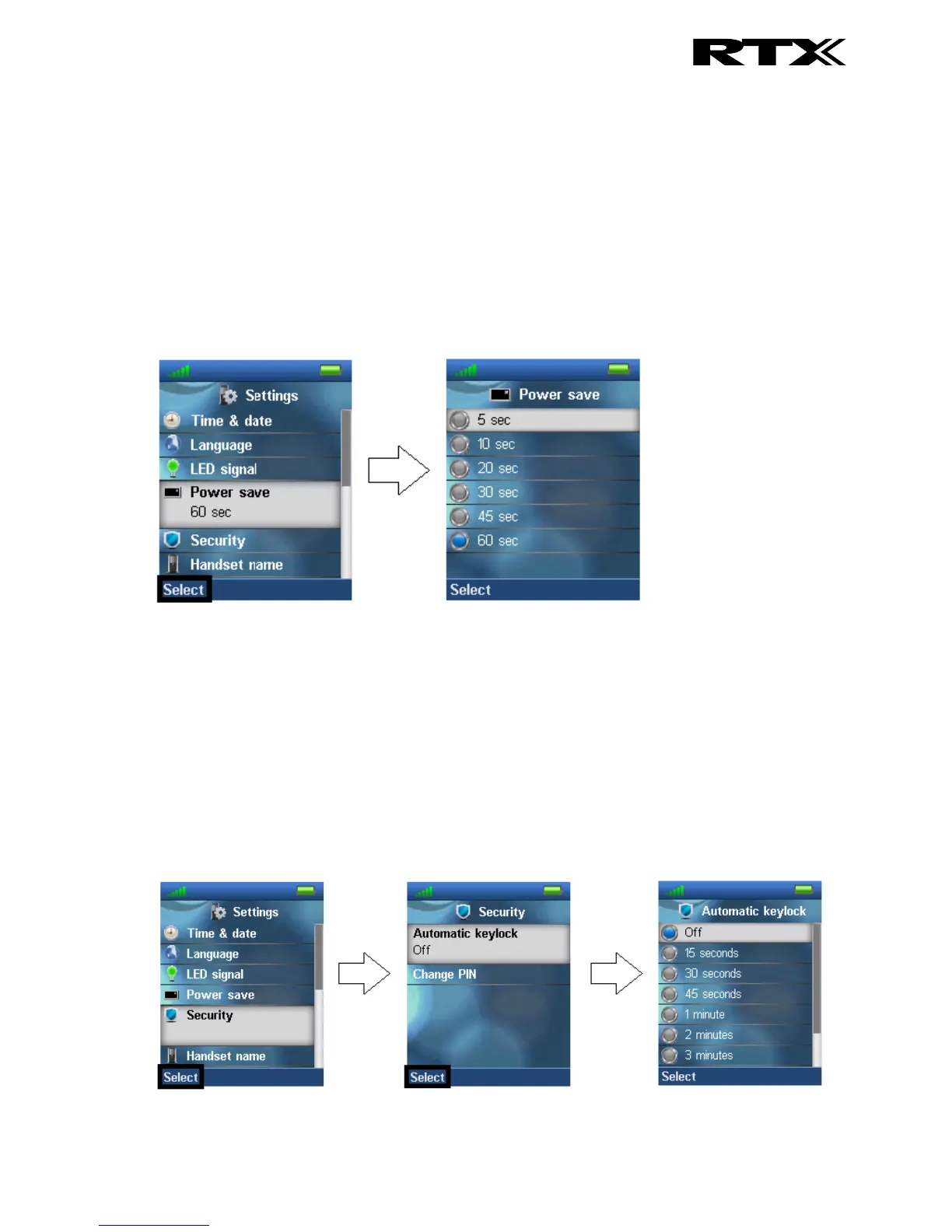 In the images above it is displayed how the power save can be set between 5 seconds and 60 seconds.