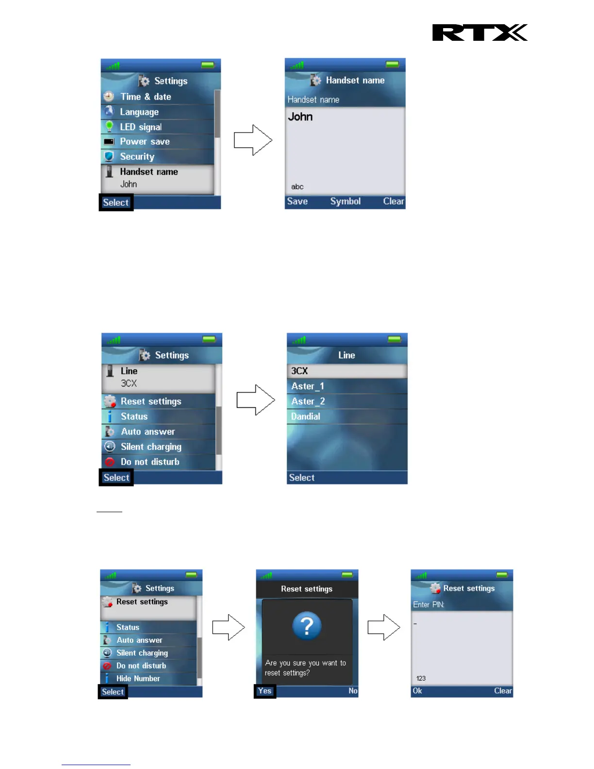 The handset settings can be reset to default settings by selecting menu “Reset settings”.